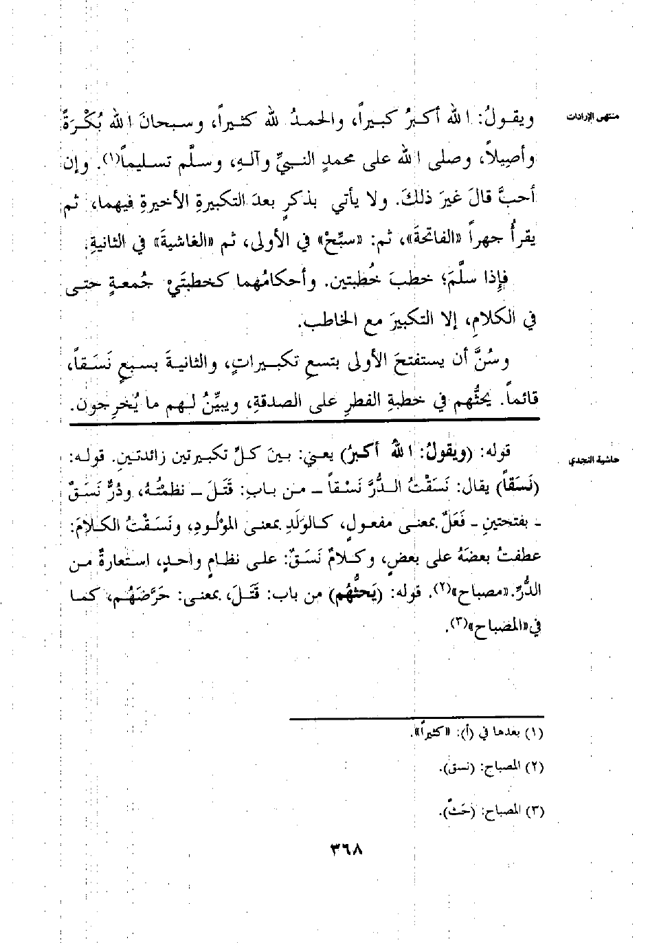 وَيَقُولُ اللَّهُ أَكْبَرُ كَبِيرًا وَالْحَمْدُ لِلَّهِ كَثِيرًا، وَسُبْحَانَ اللَّهِ بُكْرَةً وَأَصِيلًا، وَصَلَّى اللَّهُ عَلَى مُحَمَّدٍ النَّبِيِّ وَآلِهِ وَسَلِّمْ تَسْلِيمًا وَإِنْ أَحَبَّ قَالَ غَيْرَ ذَلِكَ وَلَا يَأْتِي بِذِكْرٍ بَعْدَ التَّكْبِيرَةِ الْأَخِيرَةِ فِيهِمَا ثُمَّ يَقْرَأُ جَهْرًا الْفَاتِحَةَ ثُمَّ سَبِّحْ فِي الْأُولَى: ثُمَّ الْغَاشِيَةَ فِي الثَّانِيَةِ فَإِذَا سَلَّمَ خَطَبَ خُطْبَتَيْنِ وَأَحْكَامُهُمَا كَخُطْبَتَيْ جُمُعَةٍ حَتَّى فِي الْكَلَامِ إلَّا التَّكْبِيرَ مَعَ الْخَاطِبِ وَيُسَنُّ أَنْ يَسْتَفْتِحَ الْأُولَى بِتِسْعِ تَكْبِيرَاتٍ والثَّانِيَةَ بِسَبْعِ نَسَقًا قَائِمًا يَحُثُّهُمْ فِي خُطْبَةِ الْفِطْرِ عَلَى الصَّدَقَةِ وَيُبَيِّنُ لَهُمْ مَا يُخْرِجُونَ