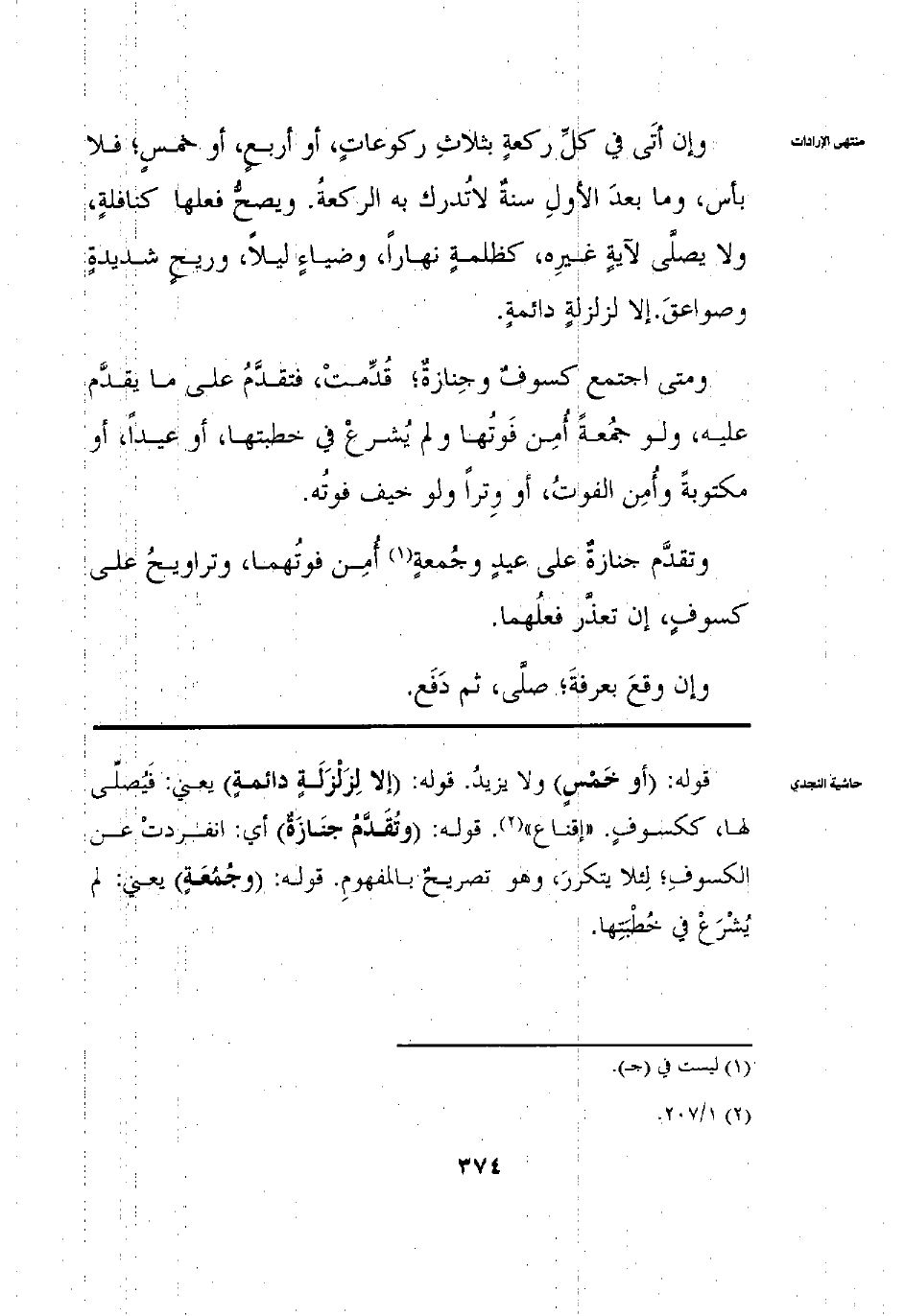 وَإِنْ أَتَى فِي كُلِّ رَكْعَةٍ بِثَلَاثِ رُكُوعَاتٍ أَوْ أَرْبَعِ أَوْ خَمْسِ فَلَا بَأْسَ وَمَا بَعْدَ الْأَوَّلِ سُنَّةٌ لَا تُدْرَكُ بِهِ الرَّكْعَةُ ويَصِحُّ فِعْلُهَا كَنَافِلَةٍ وَلَا يُصَلَّى لِآيَةٍ غَيْرِهِ كَظُلْمَةِ نَهَارٍ، وَضِيَاءٍ وَرِيحٍ شَدِيدَةٍ، وَصَوَاعِقَ إلَّا لِزَلْزَلَةٍ دَائِمَةٍ وَمَتَى اجْتَمَعَ كُسُوفٌ وَجِنَازَةٌ قُدِّمَتْ فَتُقَدَّمُ عَلَى مَا يُقَدَّمُ عَلَيْهِ وَلَوْ جُمُعَةً أُمِنَ فَوْتُهَا وَلَمْ يُشْرَعْ فِي خُطْبَتِهَا أَوْ عِيدًا أَوْ مَكْتُوبَةً وَأُمِنَ الْفَوْتُ أَوْ وِتْرًا وَلَوْ خِيفَ فَوْتُهُ وَتُقَدَّمُ جِنَازَةٌ عَلَى عِيدٍ وَجُمُعَةٍ أُمِنَ فَوْتُهُمَا وتَرَاوِيحُ عَلَى كُسُوفٍ إنْ تَعَذَّرَ فِعْلُهُمَا وَإِنْ وَقَعَ بِعَرَفَةَ صَلَّى ثُمَّ دَفَعَ