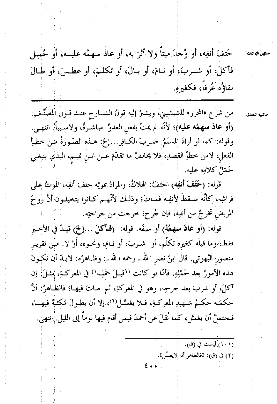 حَتْفَ أَنْفِهِ أَوْ وُجِدَ مَيِّتًا وَلَا أَثَرَ بِهِ أَوْ عَادَ سَهْمُهُ عَلَيْهِ أَوْ حُمِلَ فَأَكَلَ أَوْ شَرِبَ أَوْ نَامَ أَوْ بَالَ أَوْ تَكَلَّمَ أَوْ عَطَسَ أَوْ طَالَ بَقَاؤُهُ عُرْفًا فَكَغَيْرِهِ