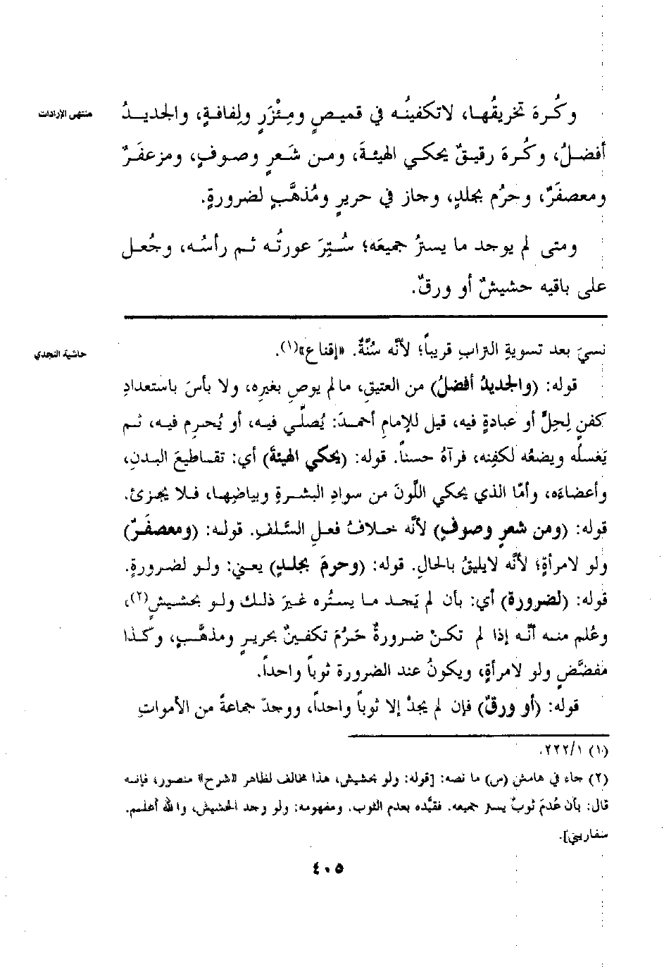 وَكُرِهَ تَخْرِيقُهَا لَا تَكْفِينُهُ فِي قَمِيصٍ وَمِئْزَرٍ وَلِفَافَةٍ والْجَدِيدُ أَفْضَلُ وَكُرِهَ بِرَقِيقٍ يَحْكِي الْهَيْئَةَ ومِنْ شَعْرٍ وصُوفٍ ومُزَعْفَرٌ وَمُعَصْفَرٌ وَحَرُمَ بِجِلْدٍ وَجَازَ فِي حَرِيرٍ وَمُذَهَّبٍ لِضَرُورَةٍ وَمَتَى لَمْ يُوجَدْ مَا يَسْتُرُ جَمِيعَهُ سُتِرَ عَوْرَتُهُ ثُمَّ رَأْسُهُ وَجُعِلَ عَلَى بَاقِيهِ حَشِيشٌ أَوْ وَرَقٌ