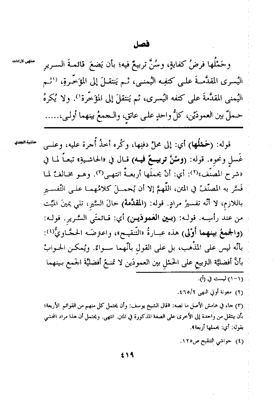 وَحَمْلُهَا فَرْضُ كِفَايَةٍ وَسُنَّ تَرْبِيعٌ فِيهِ بِأَنْ يَضَعَ قَائِمَةَ السَّرِيرِ الْيُسْرَى الْمُقَدَّمَةَ عَلَى كَتِفِهِ الْيُمْنَى، ثُمَّ يَنْتَقِلُ إلَى الْمُؤَخَّرَةِ ثُمَّ الْيُمْنَى الْمُقَدَّمَةَ عَلَى كَتِفِهِ الْيُسْرَى ثُمَّ يَنْتَقِلُ إلَى الْمُؤَخَّرَةِ وَلَا يُكْرَهُ حَمْلُ بَيْنَ الْعَمُودَيْنِ كُلُّ وَاحِدٍ عَلَى عَاتِقٍ وَالْجَمْعُ بَيْنَهُمَا أَوْلَى