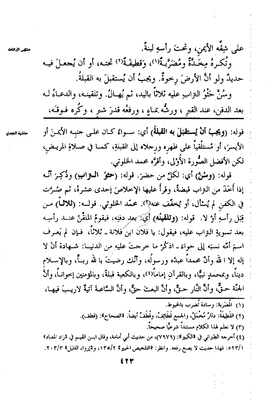 عَلَى شِقِّهِ الْأَيْمَنِ وَتَحْتَ رَأْسِهِ لَبِنَةً وَتُكْرَهُ مِخَدَّةٌ ومِضْرَبَةٌ وَقَطِيفَةٌ تَحْتَهُ أَوْ أَنْ يُجْعَلَ فِيهِ حَدِيدٌ وَلَوْ أَنَّ الْأَرْضَ رَخْوَةٌ وَيَجِبُ أَنْ يُسْتَقْبَلَ بِهِ الْقِبْلَةُ وَيُسَنُّ حَثْوُ التُّرَابِ عَلَيْهِ ثَلَاثًا بِالْيَدِ ثُمَّ يُهَالُ وَتَلْقِينُهُ وَالدُّعَاءُ بَعْدَ الدَّفْنِ عِنْدَ الْقَبْرِ وَرَشُّهُ بِمَاءٍ وَرَفْعُهُ قَدْرَ شِبْرٍ وَكُرِهَ فَرْقُهُ