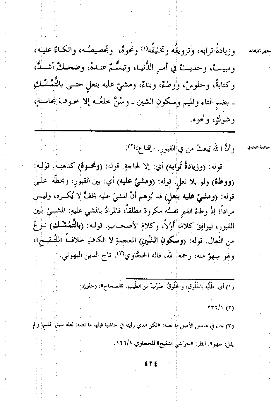 وَزِيَادَةُ تُرَابِهِ وَتَزْوِيقُهُ وَتَخْلِيقُهُ وَنَحْوِهِ وتَجْصِيصُهُ وَاتِّكَاءٌ عَلَيْهِ وَمَبِيتٌ وَحَدِيثٌ فِي أَمْرِ الدُّنْيَا، وَتَبَسُّمٌ عِنْدَهُ، وَضَحِكٌ أَشَدُّ وَكِتَابَةٌ وَجُلُوسٌ وَوَطْءٌ وَبِنَاءُ ومَشْيٌ عَلَيْهِ بِنَعْلٍ حَتَّى بِالتُّمُشْكِ - بِضَمِّ التَّاءِ وَالْمِيمِ وَسُكُونِ الشِّينِ وَسُنَّ خَلْعُهُ إلَّا خَوْفَ نَجَاسَةٍ وشَوْكٍ وَنَحْوِهِ