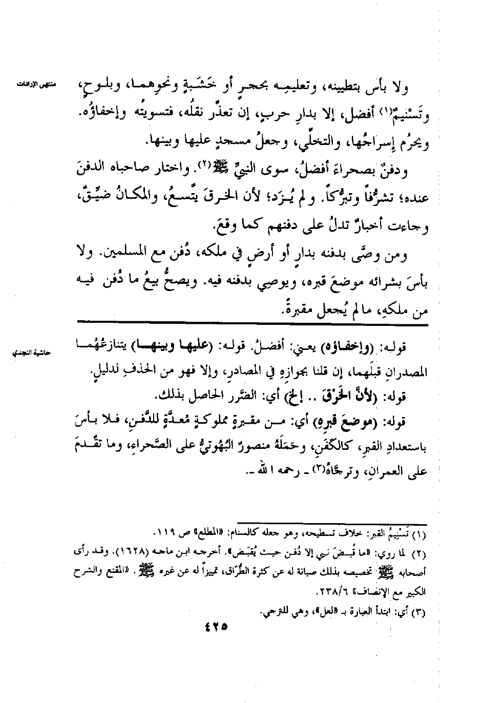 وَلَا بَأْسَ بِتَطْبِيقِهِ وَتَعْلِيمِهِ بِحَجَرٍ أَوْ خَشَبَةٍ وَنَحْوِهِمَا وَبِلَوْحٍ وَتَسْنِيمُ أَفْضُلُ إلَّا بِدَارِ حَرْبٍ إنْ تَعَذَّرَ نَقْلُهُ فَتَسْوِيَتُهُ وَإِخْفَاؤُهُ وَيَحْرُمُ إسْرَاجُهَا وَالتَّخَلِّي وَجَعْلُ مَسْجِدٍ عَلَيْهَا وَبَيْنَهَا وَدَفْنٌ بِصَحْرَاءَ أَفْضَلُ سِوَى النَّبِيِّ صَلَّى اللَّهُ عَلَيْهِ وَسَلَّمَ وَاخْتَارَ صَاحِبَاهُ الدَّفْنَ عِنْدَهُ تَشَرُّفًا وَتَبَرُّكًا وَلَمْ يُزَدْ لِأَنَّ الْخَرْقَ يَتَّسِعُ وَالْمَكَانُ ضَيِّقٌ وَجَاءَتْ أَخْبَارٌ تَدُلُّ عَلَى دَفْنِهِمْ كَمَا وَقَعَ وَمَنْ وَصَّى بِدَفْنِهِ بِدَارٍ أَوْ أَرْضٍ فِي مِلْكِهِ دُفِنَ مَعَ الْمُسْلِمِينَ ولَا بَأْسَ بِشِرَائِهِ مَوْضِعَ قَبْرِهِ وَيُوصِي بِدَفْنِهِ فِيهِ وَيَصِحُّ بَيْعُ مَا دُفِنَ فِيهِ مِنْ مِلْكِهِ مَا لَمْ يُجْعَلْ مَقْبَرَةً