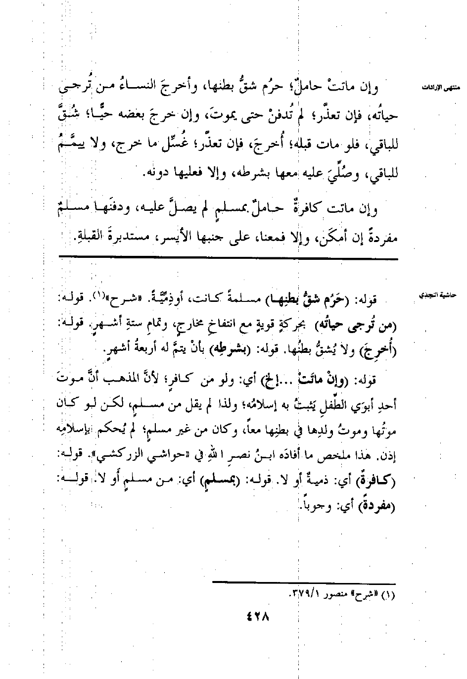 وَإِنْ مَاتَتْ حَامِلٌ حَرُمَ شَقُّ بَطْنِهَا وَأَخْرَجَ النِّسَاءَ مَنْ تُرْجَى حَيَاتُهُ فَإِنْ تَعَذَّرَ لَمْ تُدْفَنْ حَتَّى يَمُوتَ وَإِنْ خَرَجَ بَعْضُهُ حَيًّا شُقَّ ل الْبَاقِي فَلَوْ مَاتَ قَبْلَهُ أُخْرِجَ فَإِنْ تَعَذَّرَ غُسِّلَ مَا خَرَجَ وَلَا يُيَمَّمُ لِلْبَاقِي وَصُلِّيَ عَلَيْهِ مَعَهَا بِشَرْطِهِ وَإِلَّا فعَلَيْهَا دُونَهُ فَإِنْ مَاتَتْ كَافِرَةٌ حَامِلٌ بِمُسْلِمٍ لَمْ يُصَلَّ عَلَيْهِ وَدَفْنُهَا بِمُسْلِمٍ مُنْفَرِدَةً إنْ أَمْكَنَ وَإِلَّا فَمَعَنَا عَلَى جَنْبِهَا الْأَيْسَرِ مُسْتَدْبِرَةً الْقِبْلَةَ