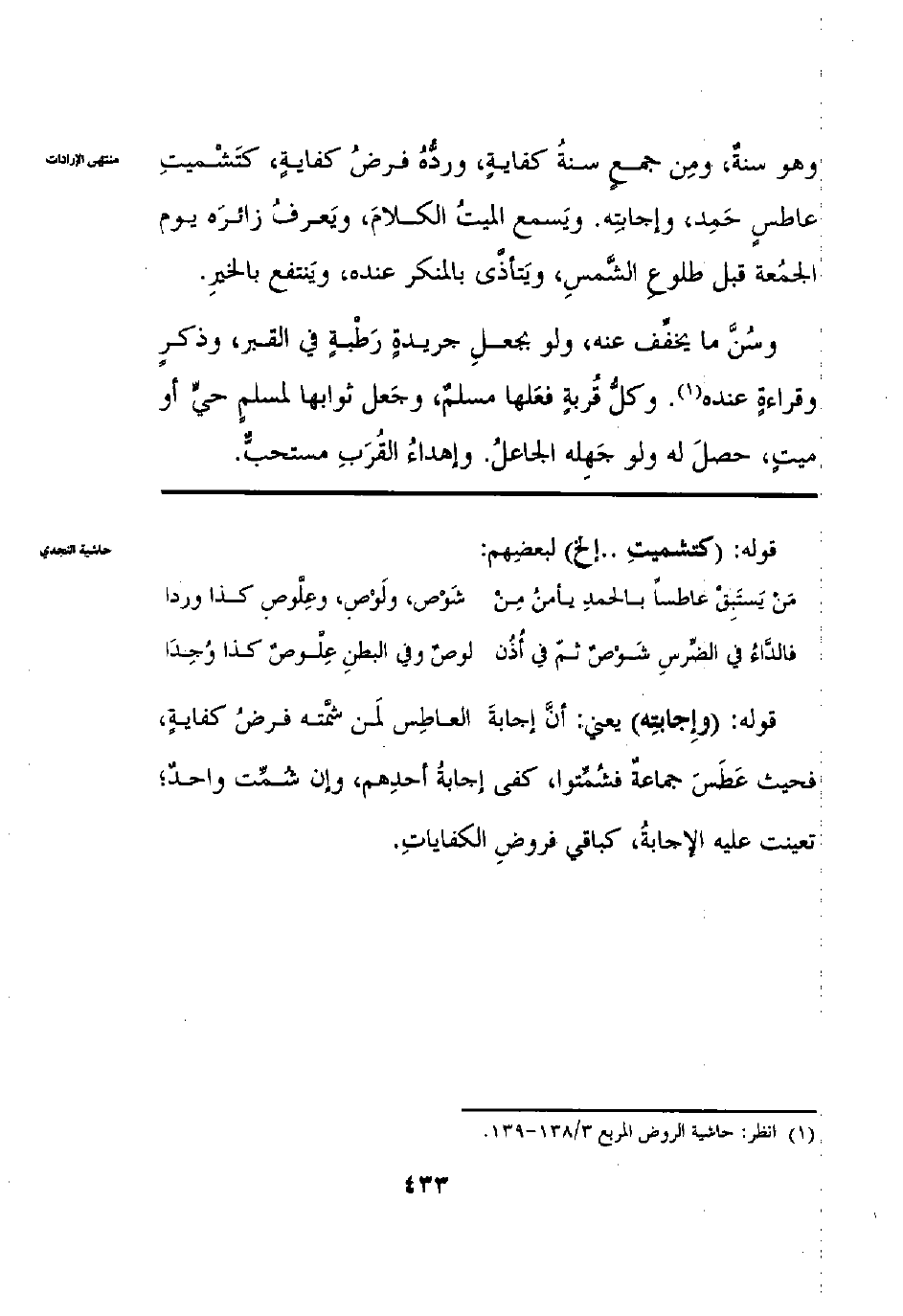 وَهُوَ سُنَّةُ وَمِنْ جَمْعٍ سُنَّةُ كِفَايَةٍ وَرَدُّهُ فَرْضُ كِفَايَةٍ كَتَشْمِيتِ عَاطِسٍ حَمِدَوَ إجَابَتِهِ وَيَسْمَعُ الْمَيِّتُ الْكَلَامَ وَيَعْرِفُ زَائِرَهُ يَوْمَ الْجُمُعَةِ قَبْلَ طُلُوعِ الشَّمْسِ وَيَتَأَذَّى بِالْمُنْكَرِ عِنْدَهُ وَيَنْتَفِعُ بِالْخَيْر وَسُنَّ مَا يُخَفِّفُ عَنْهُ وَلَوْ بِجَعْلِ جَرِيدَةٍ رَطْبَةٍ فِي الْقَبْرِ وبِذِكْرٍ وَقِرَاءَةٍ عِنْدَهُ وَكُلُّ قُرْبَةٍ فَعَلَهَا مُسْلِمٌ وَجَعَلَ ثَوَابَهَا لِمُسْلِمٍ حَيٍّ أَوْ مَيِّتٍ حَصَلَ لَهُ وَلَوْ جَهِلَهُ الْجَاعِلُ وَإِهْدَاءُ الْقُرَبِ مُسْتَحَبٌّ