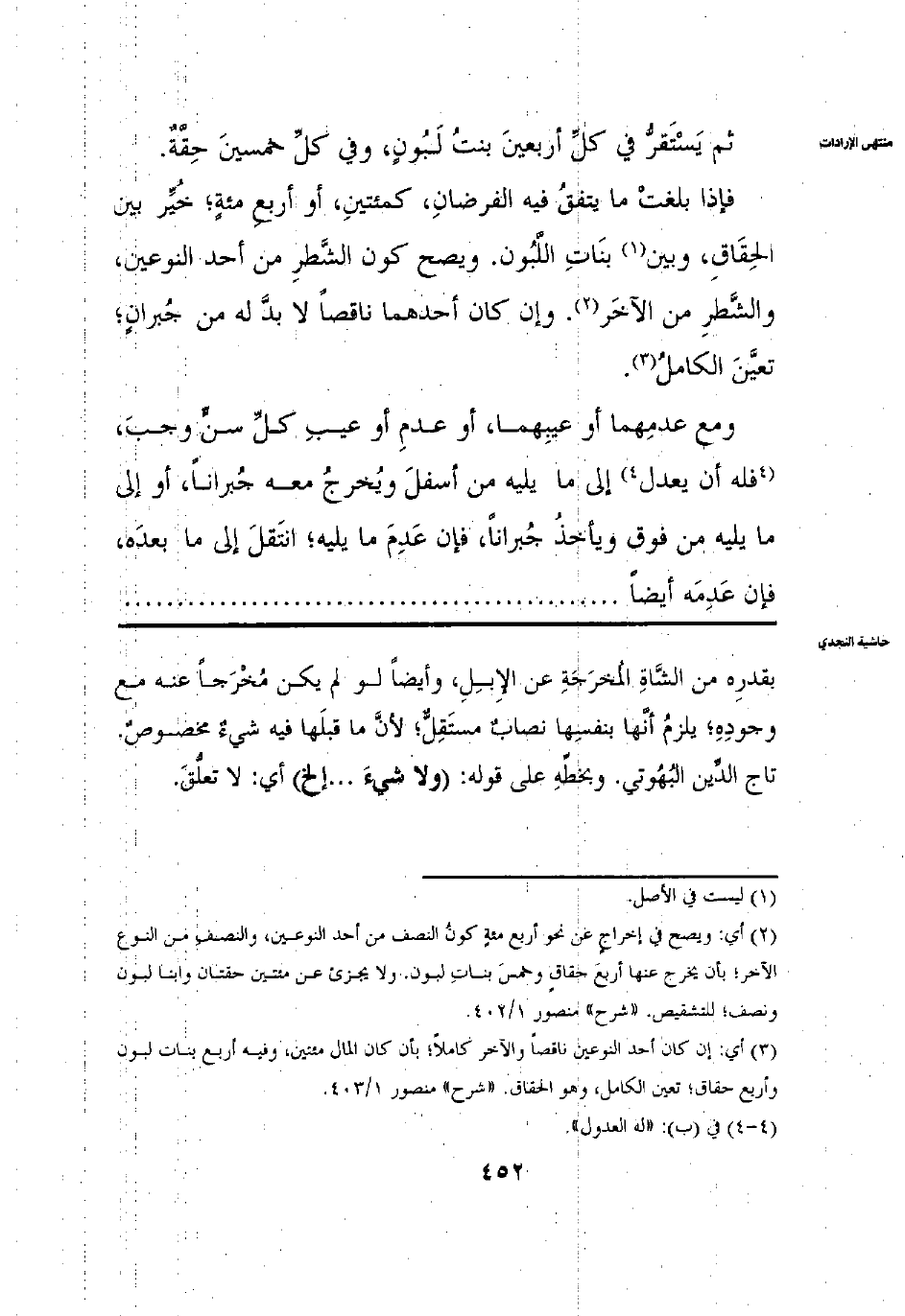 ثُمَّ تَسْتَقِرُّ فِي كُلِّ أَرْبَعِينَ بِنْتُ لَبُونٍ وَفِي كُلِّ خَمْسِينَ حِقَّةٌ فَإِذَا بَلَغَتْ مَا يَتَّفِقُ فِيهِ الْفَرْضَانِ كَمِائَتَيْنِ أَوْ أَرْبَعِمِائَةٍ خَيْرُ بَيْنَ الْحِقَاقِ وَبَيْنَ بَنَاتِ اللَّبُونِ وَيَصِحُّ كَوْنُ الشَّطْرِ مِنْ أَحَدِ النَّوْعَيْنِ وَالشَّطْرِ مِنْ الْآخَرِ وَإِنْ كَانَ أَحَدُهُمَا نَاقِصًا لَا بُدَّ لَهُ مِنْ جُبْرَانٍ تَعَيَّنَ الْكَامِلُ وَمَعَ عَدَمِهِمَا أَوْ عَيْبِهِمَا أَوْ عَدَمِ أَوْ عَيْبِ كُلِّ سِنٍّ وَجَبَ فَلَهُ أَنْ يَعْدِلَ إلَى مَا يَلِيهِ مِنْ أَسْفَلَ وَيَخْرُجُ مَعَهُ جُبْرَانًا أَوْ إلَى مَا يَلِيهِ مِنْ فَوْقُ وَيَأْخُذُ جُبْرَانًا فَإِنْ عُدِمَ مَا يَلِيهِ انْتَقَلَ إلَى مَا بَعْدَهُ فَإِنْ عَدِمَهُ أَيْضًا