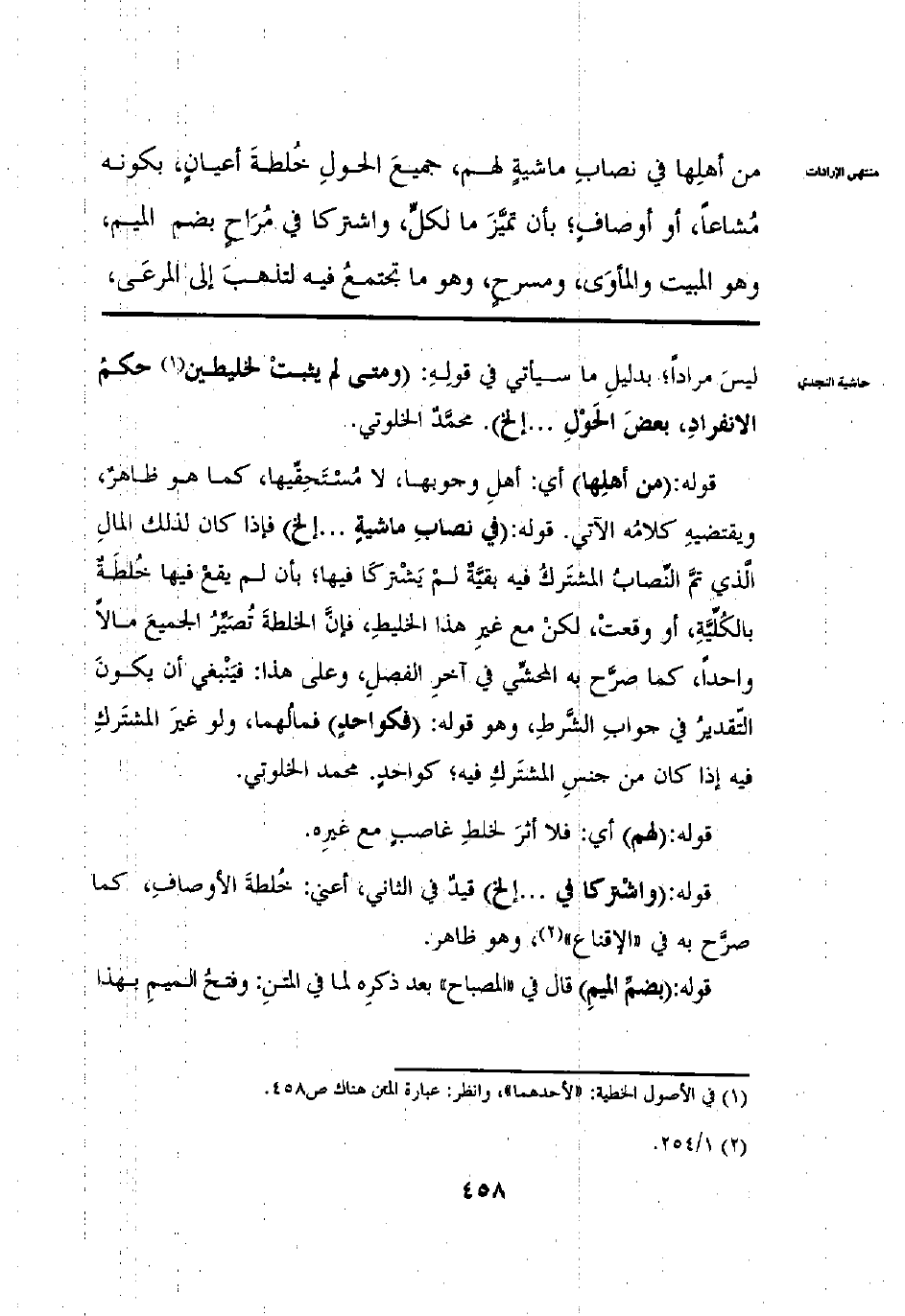 من أهلها فِي نِصَابٍ مَاشِيَةً لَهُمْ جَمِيعَ الْحَوْلِ خُلْطَةَ أَعْيَانٍ بِكَوْنِهِ مَشَاعًا أَوْأَوْصَافٍ بِأَنْ تَمَيَّزَ مَا لِكُلٍّ وَاشْتَرَكَا فِي مُرَاحٍ بِضَمِّ الْمِيمِ وَهُوَ الْمَبِيتُ وَالْمَأْوَى وَمَسْرَحٍ وَهُوَ مَا تَجْتَمِعُ السَّائِمَةُ فِيهِ لِتَذْهَبَ إلَى الْمَرْعَى