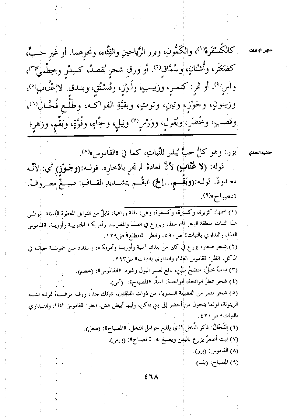 كَالْكُسْفَرَةِ وَالْكَمُّونِ وَبَزْرِ الرَّيَاحِينِ والْقِثَّاءِ وَنَحْوِهِمَا أَوْ غَيْرِ حَبٍّ كَصَعْتَرٍ وَأُشْنَانٍ وَسِمَاقٍ أَوْ وَرَقِ شَجَرٍ يَقْصِدُ كَسِدْرٍ وَخِطْمِيٍّ وَآسٍ أَوْ ثَمَرٍ كَتَمْرٍ وَزَبِيبٍ وَلَوْز وَفُسْتُقٍ وَبُنْدُقٍ لَا عُنَّابٍ وَزَيْتُونٍ وجَوْزٍ وَتِينٍ وَتُوتٍ وبَقِيَّةِ الْفَوَاكِهِ وَطَلْعِ فُحَّالٍ وَقَصَبٍ وَخَضْرٍ وَبُقُولٍ وَوَرْسٍ وَنُبُلٍ وَحِنَّاءٍ وفوة وَبَقَّمٍ وَزَهْرٍ