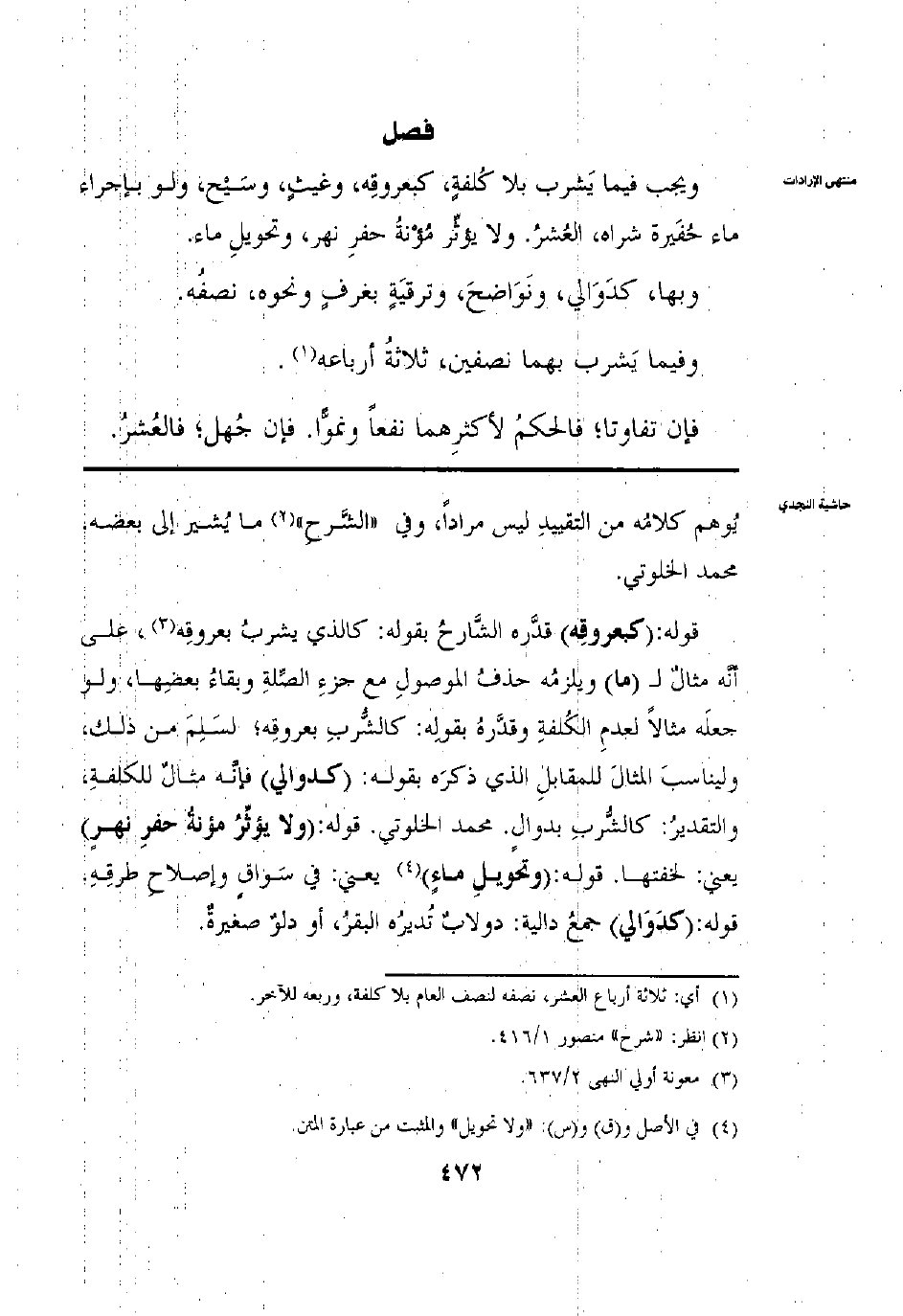 ويجب فيما يشرب بلا كلفة كبِعُرُوقِهِ وَغَيْثٍ وَبِسَيْحٍ وَلَوْ بِإِجْرَاءِ مَاءِ حَفِيرَةٍ شَرَاهُ الْعُشْرُ وَلَا تُؤَثِّرُ مُؤْنَةُ حَفْرِ نَهْرٍ وتَحْوِيلِ مَاءٍ وبِهَا، كَدَوَالٍ ونَوَاضِحَ وَتَرْقِيَةُ بِغَرْفٍ وَنَحْوِهِ: نِصْفُهُ وفِيمَا يُشْرِبُ بِهِمَا نِصْفَانِ بِثَلَاثَةِ أَرْبَاعِهِ فَإِنْ تَفَاوَتَا فَالْحُكْمُ لِأَكْثَرِهِمَا نَفْعًا وَنُمُوًّا فَإِنْ جُهِلَ فَالْعُشْرُ