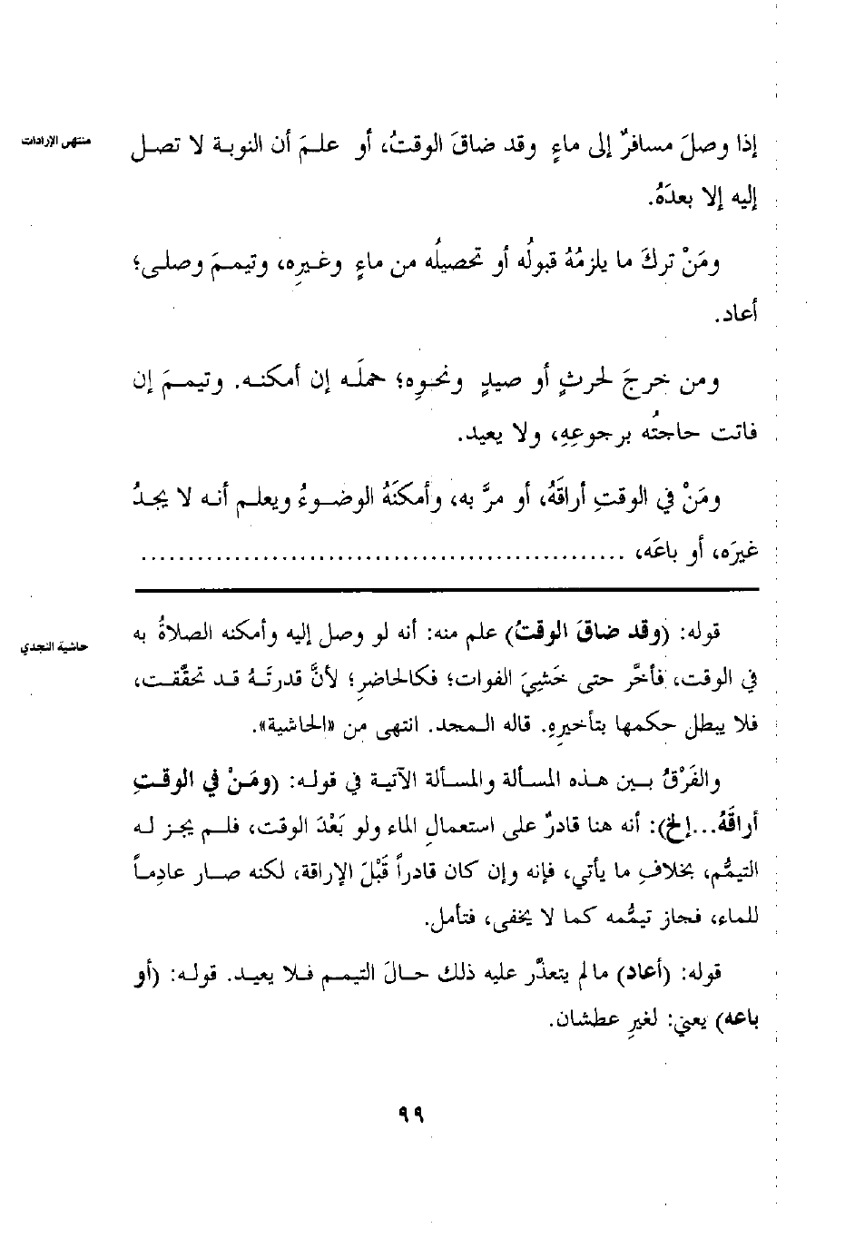 إذَا وَصَلَ مُسَافِرٌ إلَى مَاءٍ وَقَدْ ضَاقَ الْوَقْتُ أَوْ عَلِمَ أَنَّ النَّوْبَةَ لَا تَصِلُ إلَيْهِ إلَّا بَعْدَهُ وَمَنْ تَرَكَ مَا يَلْزَمُهُ قَبُولُهُ أَوْ تَحْصِيلُهُ مِنْ مَاءٍ وَغَيْرِهِ وَتَيَمَّمَ وَصَلَّى. أَعَادَ وَمَنْ خَرَجَ لِحَرْثٍ أَوْ صَيْدٍ وَنَحْوِهِ حَمَلَهُ إنْ أَمْكَنَهُ وتَيَمَّمَ إنْ فَاتَتْ حَاجَتُهُ بِرُجُوعِهِ وَلَا يُعِيدُ وَمَنْ فِي الْوَقْتِ أَرَاقَهُ أَوْ مَرَّ بِهِ وَأَمْكَنَهُ الْوُضُوءُ وَيَعْلَمُ أَنَّهُ لَا يَجِدُ غَيْرَهُ أَوْ بَاعَهُ
