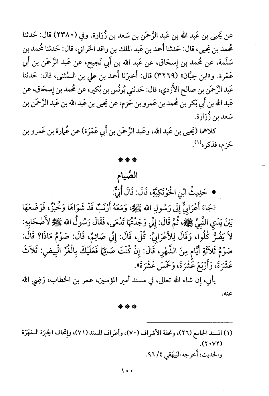 «جاء أعرابي إلى رسول الله صَلى الله عَليه وسَلم ومعه أرنب قد شواها وخبز، فوضعها بين يدي النبي صَلى الله عَليه وسَلم ثم قال: إني وجدتها تدمى، فقال رسول الله صَلى الله عَليه وسَلم لأصحابه: لا يضر كلوا، وقال للأعرابي: كل، قال: إني صائم، قال: صوم ماذا؟ قال: صوم ثلاثة أيام من الشهر، قال: إن كنت صائما فعليك بالغر البيض: ثلاث عشرة، وأربع عشرة، وخمس عشرة».