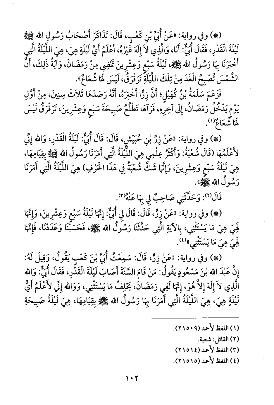 - وفي رواية: «عن زر، قال: سمعت أُبي بن كعب يقول، وقيل له: إن عبد الله بن مسعود يقول: من قام السنة أصاب ليلة القدر، فقال أبي: والله الذي لا إله إلا هو، إنها لفي رمضان، يحلف ما يستثني، ووالله إني لأعلم أي ليلة هي، هي الليلة التي أمرنا بها رسول الله صَلى الله عَليه وسَلم بقيامها، هي ليلة صبيحة