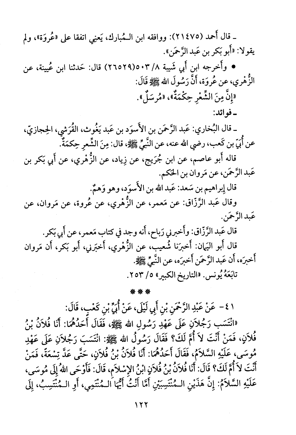 - قال البخاري: عبد الرَّحمَن بن الأسود بن عبد يغوث، القرشي، الحجازي، عن أُبي بن كعب، رضي الله عنه، عن النبي صَلى الله عَليه وسَلم قال: من الشعر حكمة.