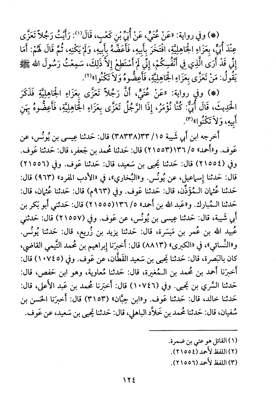 - وفي رواية: «عن عتي، أن رجلا تعزى بعزاء الجاهلية فذكر الحديث، قال أبي: كنا نؤمر، إذا الرجل تعزى بعزاء الجاهلية، فأعضوه بهن أبيه، ولا تكنوا» (¬١).