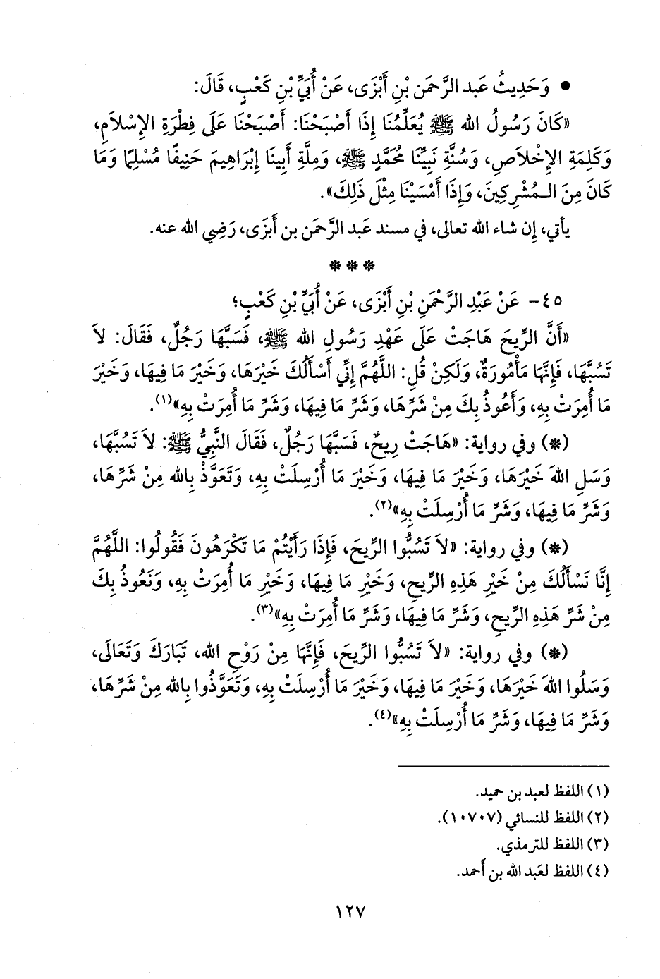 - وفي رواية: «لا تسبوا الريح، فإنها من روح الله، تبارك وتعالى، وسلوا الله خيرها، وخير ما فيها، وخير ما أرسلت به، وتعوذوا بالله من شرها، وشر ما فيها، وشر ما أرسلت به» (¬٤).