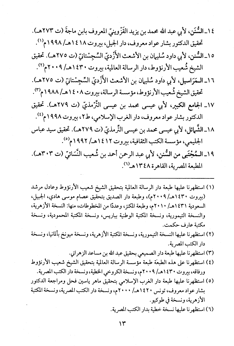 ١٥ - السُّنن، لأبي داود سليمان بن الأشعث الأَزْديّ السِّجِسْتانيّ (ت ٢٧٥ هـ). تحقيق الشيخ شُعيب الأرنؤوط، دار الرسالة العالمية، بيروت ١٤٣٠ هـ / ٢٠٠٩ م (٢).