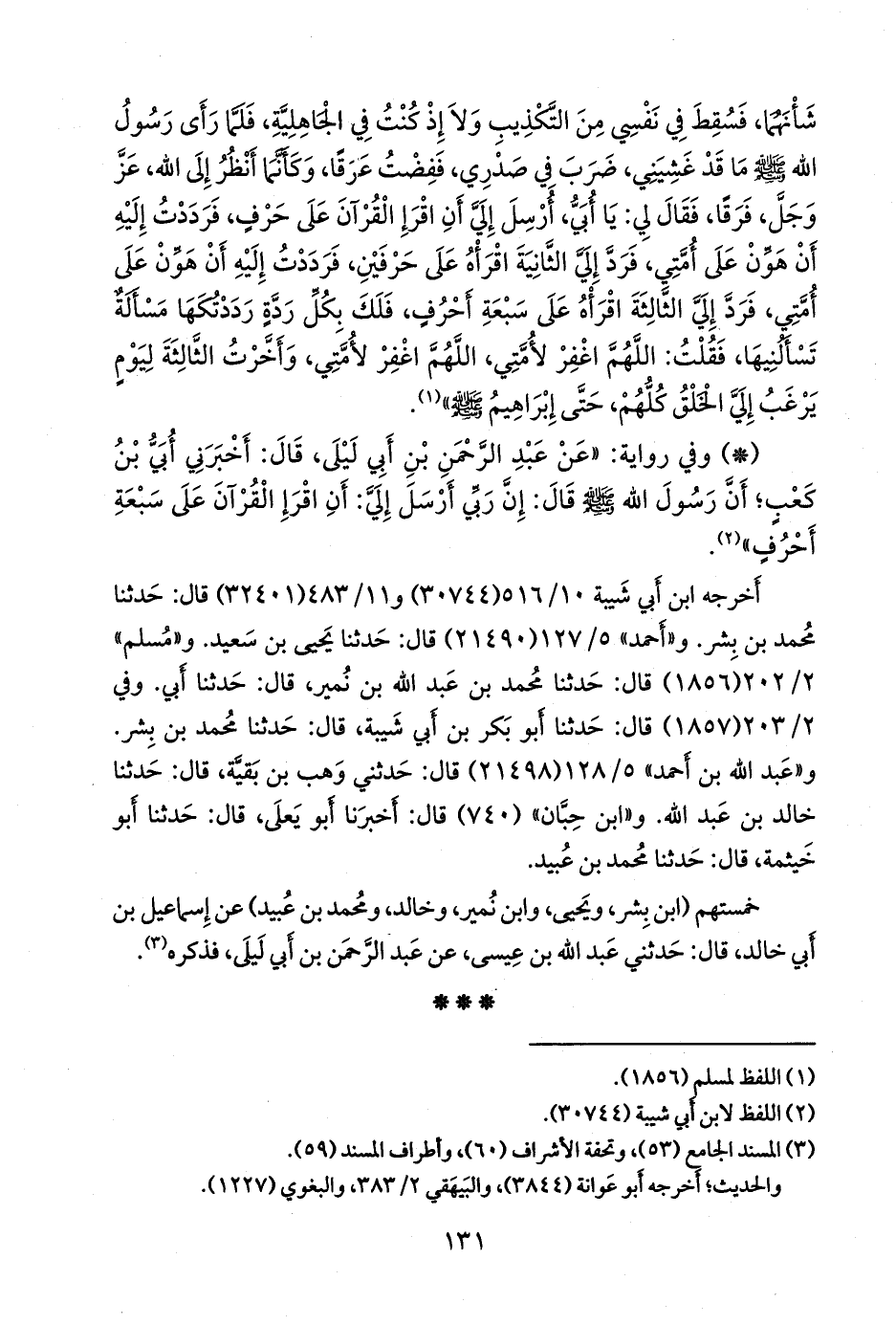 - وفي رواية: «عن عبد الرَّحمَن بن أبي ليلى، قال: أخبرني أُبي بن كعب؛ أن رسول الله صَلى الله عَليه وسَلم قال: إن ربي أرسل إلي: أن اقرإ على سبعة أحرف» (¬١).