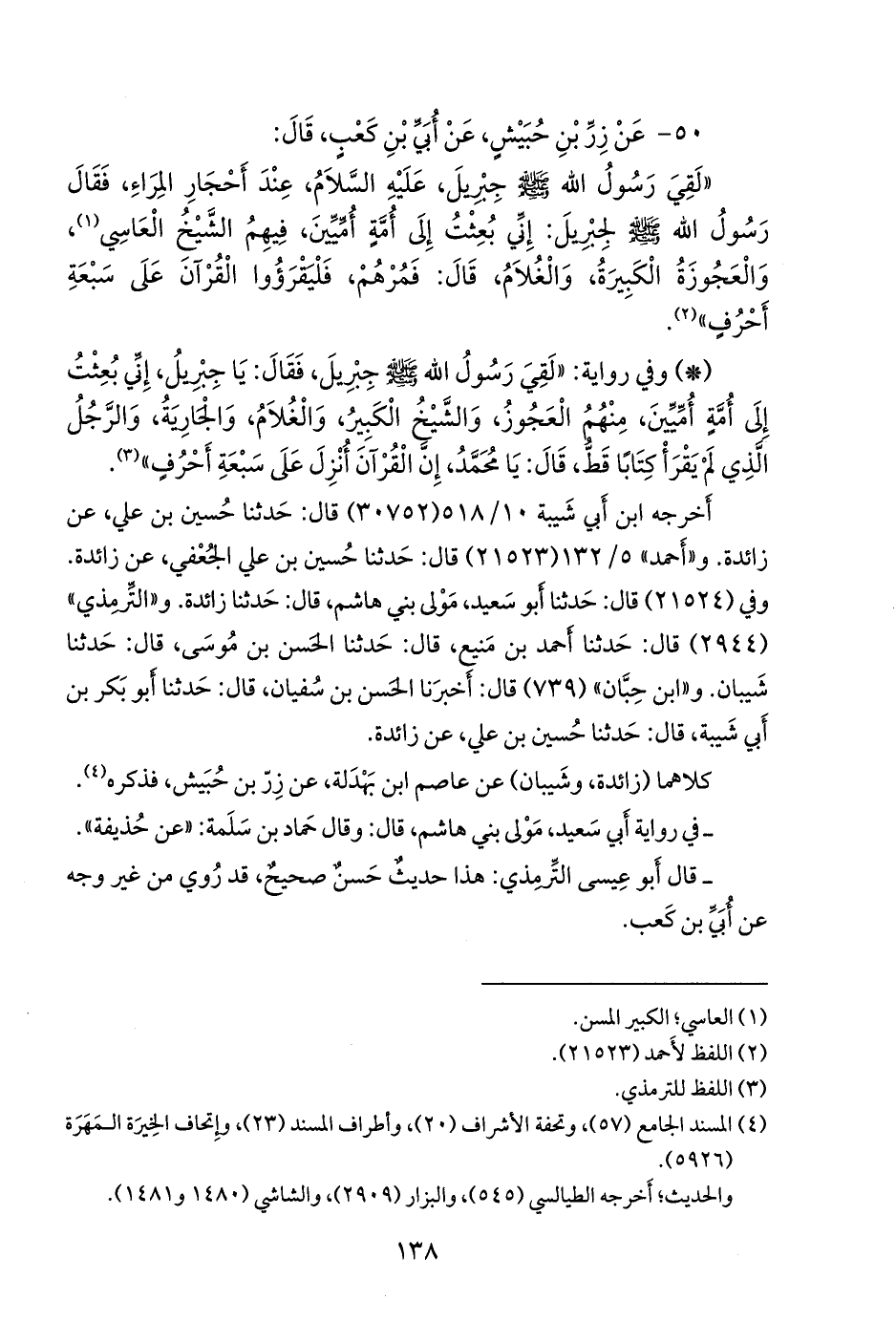 ٥٠ - عن زِرّ بن حُبَيش، عن أُبي بن كعب، قال: