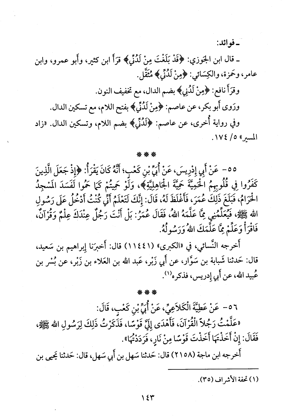 ٥٥ - عن أبي إدريس، عن أُبي بن كعب؛ أنه كان يقرأ: {إذ جعل الذين كفروا في قلوبهم الحمية حمية الجاهلية}، ولو حميتم كما حموا لفسد المسجد الحرام، فبلغ ذلك عمر، فأغلظ له، قال: إنك لتعلم أني كنت أدخل على رسول الله صَلى الله عَليه وسَلم فيعلمني مما علمه الله، فقال عمر: بل أنت رجل عندك علم وقرآن، فاقرأ وعلم مما علمك الله ورسوله.