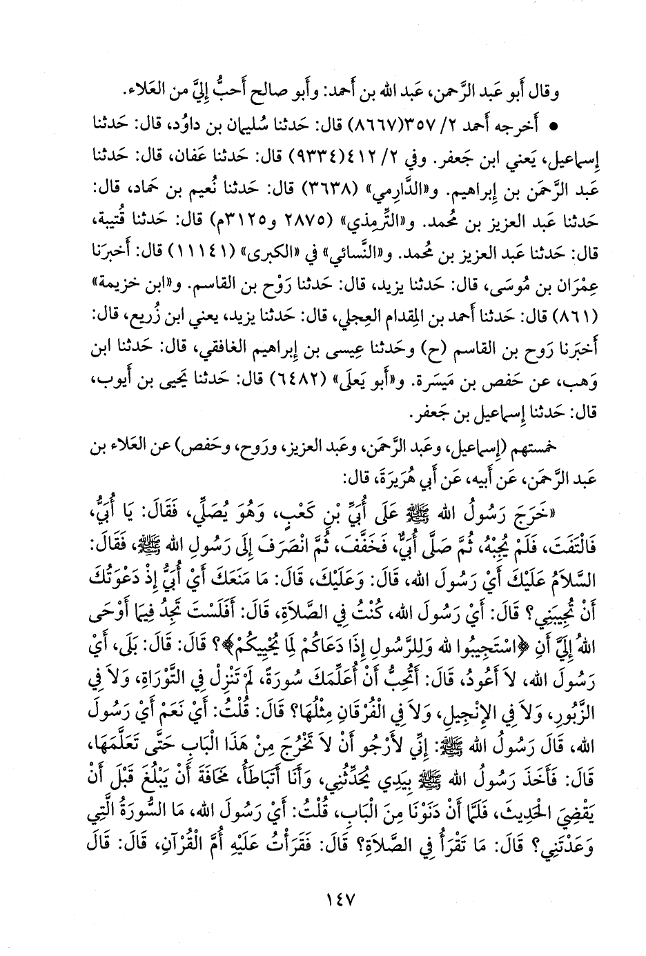 «خرج رسول الله صلى الله عليه وسلم على أُبي بن كعب، وهو يصلي، فقال: يا أبي، فالتفت فلم يجبه، ثم صلى أبي فخفف، ثم انصرف إلى رسول الله صلى الله عليه وسلم، فقال: السلام عليك، أي رسول الله، قال: وعليك، قال: ما منعك، أي أبي، إذ دعوتك أن تجيبني؟ قال: أي رسول الله، كنت في الصلاة، قال: أفلست تجد فيما أوحى الله إلي، أن {استجيبوا لله وللرسول إذا دعاكم لما يحييكم}؟ قال: قال: بلى، أي رسول الله، لا أعود، قال: أتحب أن أعلمك سورة، لم ينزل في التوراة، ولا في الزبور، ولا في الإنجيل، ولا في الفرقان مثلها؟ قال: قلت: نعم، أي رسول الله، فقال رسول الله صلى الله عليه وسلم: إني لأرجو أن لا تخرج من هذا الباب حتى تعلمها، قال: فأخذ رسول الله صلى الله عليه وسلم بيدي، يحدثني وأنا أتباطأ مخافة أن يبلغ قبل أن يقضي الحديث، فلما أن دنونا من الباب، قلت: أي رسول الله، ما السورة التي وعدتني؟ قال: ما تقرأ في الصلاة؟ قال: فقرأت عليه أم القرآن، قال: قال