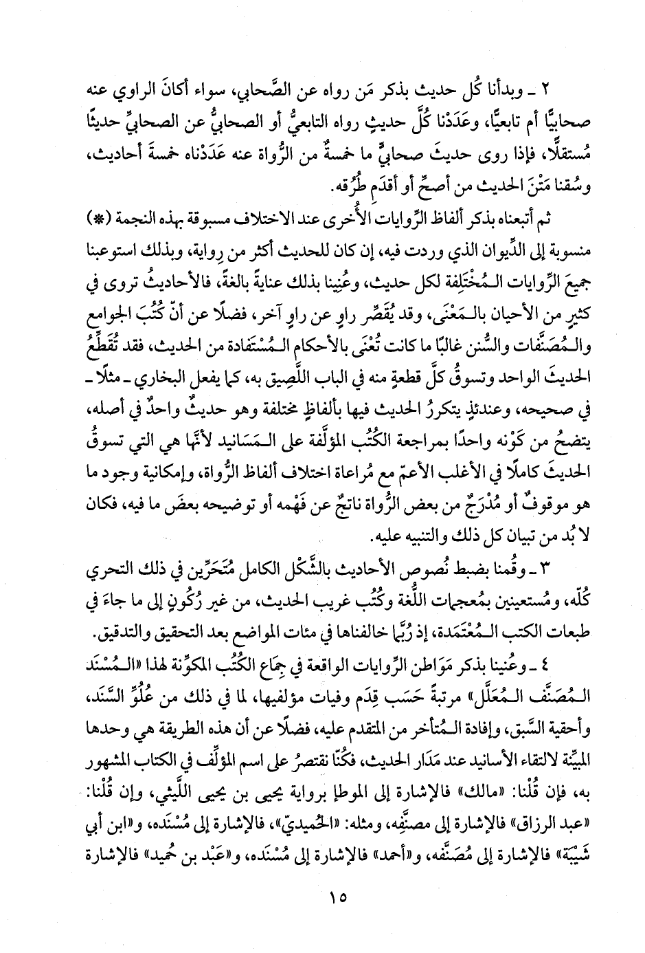 ثم أتبعناه بذكر ألفاظ الرِّوايات الأُخرى عند الاختلاف مسبوقة بهذه النجمة (*) منسوبة إلى الدِّيوان الذي وردت فيه، إن كان للحديث أكثر من رِواية، وبذلك استوعبنا جميعَ الرِّوايات المُخْتَلِفة لكل حديث، وعُنِينا بذلك عنايةً بالغةً، فالأحاديثُ تروى في كثيرٍ من الأحيان بالمَعْنَى، وقد يُقَصِّر راوٍ عن راوٍ آخر، فضلًا عن أنّ كُتُبَ الجوامع والمُصَنَّفات والسُّنن غالبًا ما كانت تُعْنَى بالأحكام المُسْتَفادة من الحديث، فقد تُقَطِّعُ الحديثَ الواحد وتسوقُ كلَّ قطعةٍ منه في الباب اللَّصِيق به، كما يفعل البخاري - مثلًا - في صحيحه، وعندئذٍ يتكررُ الحديث فيها بألفاظٍ مختلفة وهو حديثٌ واحدٌ في أصله، يتضحُ من كَوْنه واحدًا بمراجعة الكُتُب المؤلَّفة على المَسَانيد لأنَّها هي التي تسوقُ الحديثَ كاملًا في الأغلب الأعمّ مع مُراعاة اختلاف ألفاظ الرُّواة، وإمكانية وجود ما هو موقوفٌ أو مُدْرَجٌ من بعض الرُّواة ناتجٌ عن فَهْمه أو توضيحه بعضَ ما فيه، فكان لا بُد من تبيان كل ذلك والتنبيه عليه.