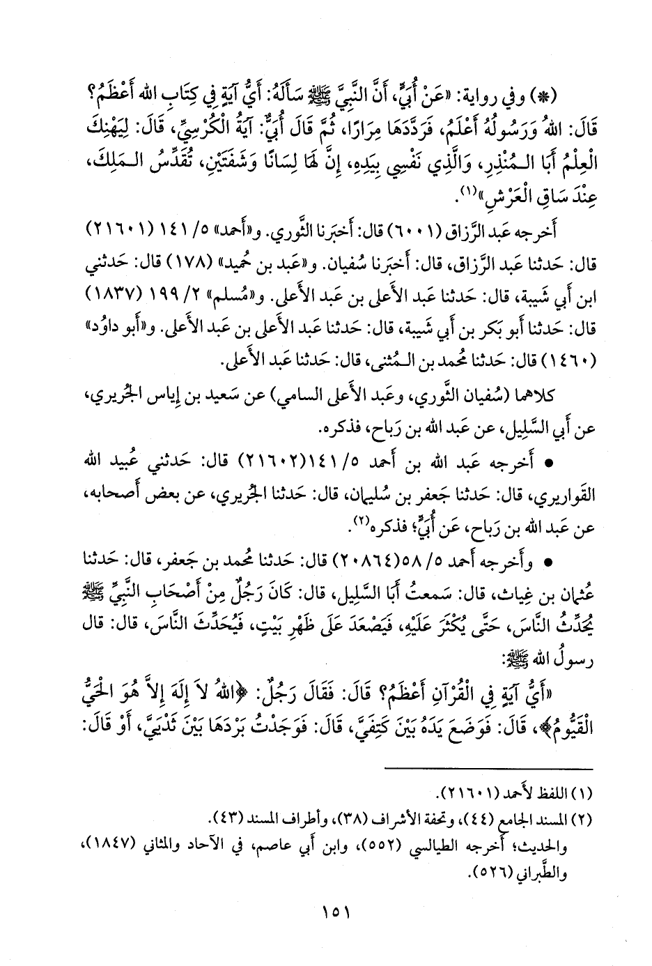 «أي آية في القرآن أعظم؟ قال: فقال رجل: {الله لا إله إلا هو الحي القيوم}، قال: فوضع يده بين كتفي، قال: فوجدت بردها بين ثديي، أو قال: