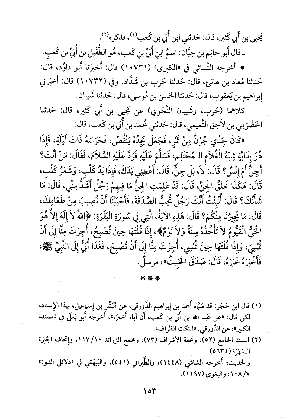 «كان لجدي جرن من تمر، فجعل يجده ينقص، فحرسه ذات ليلة، فإذا هو بدابة شبه الغلام المحتلم، فسلم عليه فرد عليه السلام، فقال: من أنت؟ أجن أم إنس؟ قال: لا، بل جن، قال: أعطني يدك، فإذا يد كلب، وشعر كلب، قال: هكذا خلق الجن، قال: قد علمت الجن ما فيهم رجل أشد مني، قال: ما شأنك؟ قال: أنبئت أنك رجل تحب الصدقة، فأحببنا أن نصيب من طعامك، قال: ما يجيرنا منكم؟ قال: هذه الآية، التي في سورة البقرة: {الله لا إله إلا هو الحي القيوم لا تأخذه سنة ولا نوم}، إذا قلتها حين تصبح، أجرت منا إلى أن تمسي، وإذا قلتها حين تمسي، أجرت منا إلى أن تصبح، فغدا أبي إلى النبي صَلى الله عَليه وسَلم فأخبره خبره، قال: صدق الخبيث».