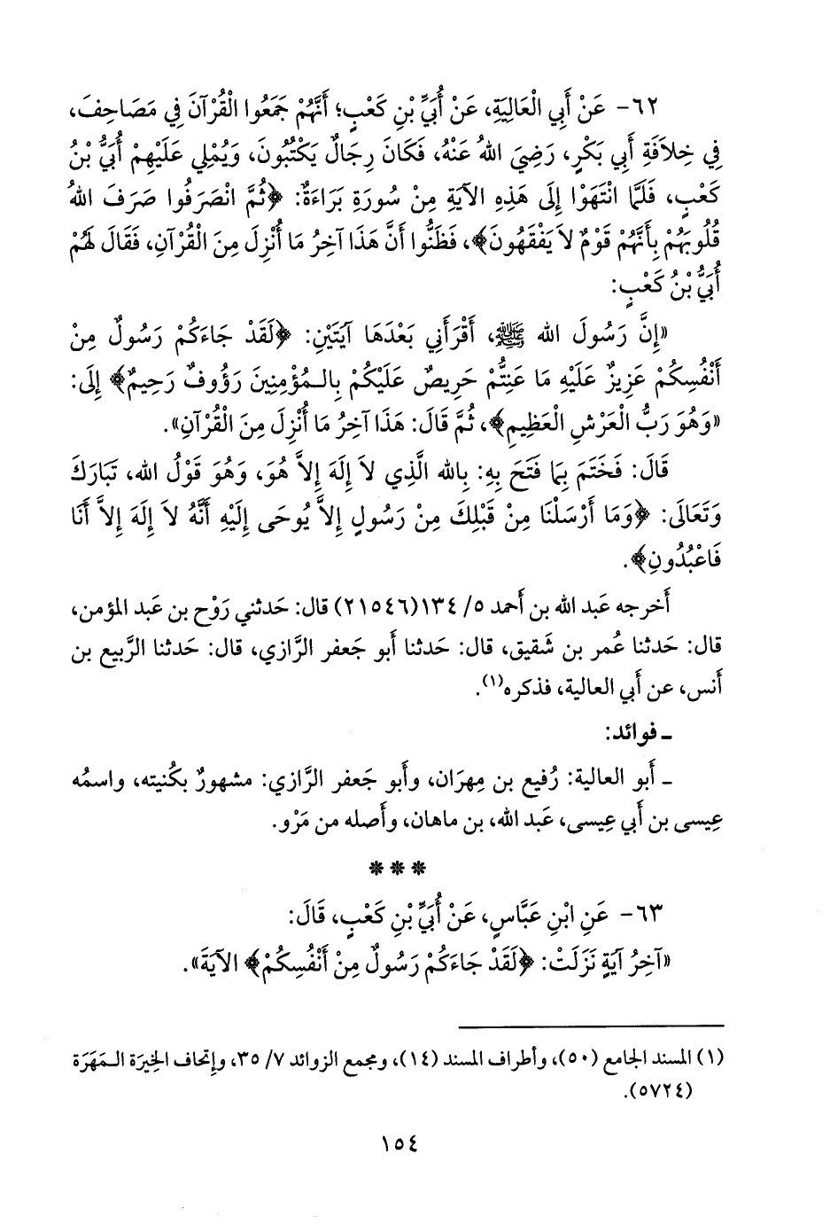 ٦٢ - عن أبي العالية، عن أُبي بن كعب؛ أنهم جمعوا القرآن في مصاحف، في خلافة أَبي بكر، رضي الله عنه، فكان رجال يكتبون، ويملي عليهم أُبي بن كعب، فلما انتهوا إلى هذه الآية من سورة براءة: {ثم انصرفوا صرف الله قلوبهم بأنهم قوم لا يفقهون}، فظنوا أن هذا آخر ما أنزل من القرآن، فقال لهم أُبي بن كعب: