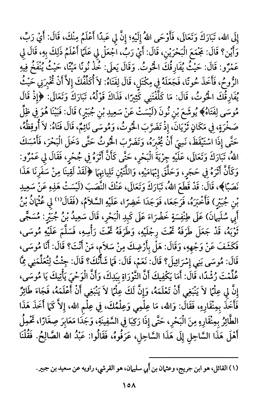 وقال يَعلى: خذ نونا ميتا، حيث ينفخ فيه الروح، فأخذ حوتا، فجعله في مكتل، قال لفتاه: لا أكلفك إلا أن تخبرني حيث يفارقك الحوت، قال: ما كلفتني كثيرا، فذاك قوله، تبارك وتعالى: {إذ قال موسى لفتاه} يوشع بن نون (ليست عن سعيد بن جبير) قال: فبينا هو في ظل صخرة، في مكان ثريان، إذ تضرب الحوت، وموسى نائم، قال فتاه: لا أوقظه، حتى إذا استيقظ، نسي أن يخبره، وتضرب الحوت حتى دخل البحر، فأمسك الله، تبارك وتعالى، عليه جرية البحر، حتى كأن أثره في جحر، فقال لي عَمرو: وكأن أثره في حجر، وحلق إبهاميه، واللتين تليانهما {لقد لقينا من سفرنا هذا نصبا}، قال: قد قطع الله، تبارك وتعالى، عنك النصب (ليست هذه عن سعيد بن جبير) فأخبره، فرجعا، فوجدا خضرا، عليه السلام، (فقال (¬١) لي عثمان بن أبي سليمان) على طنفسة خضراء على كبد البحر، قال سعيد بن جبير: مسجى ثوبه، قد جعل طرفه تحت رجليه، وطرفه تحت رأسه، فسلم عليه موسى، فكشف عن وجهه، وقال: هل بأرضك من سلام، من أنت؟ قال: أنا موسى، قال: موسى بني إسرائيل؟ قال: نعم، قال: فما شأنك؟ قال: جئت لتعلمني مما علمت رشدا، قال: أما يكفيك أن التوراة بيدك، وأن الوحي يأتيك يا موسى، إن لي علما لا ينبغي أن تعلمه، وإن لك علما لا ينبغي أن أعلمه، فجاء طائر فأخذ بمنقاره، فقال: والله، ما علمي وعلمك، في علم الله، إلا كما أخذ هذا الطائر بمنقاره من البحر، حتى إذا ركبا في السفينة، وجدا معابر صغارا، تحمل أهل هذا الساحل إلى هذا الساحل، عرفوه، فقالوا: عبد الله الصالح. فقلنا