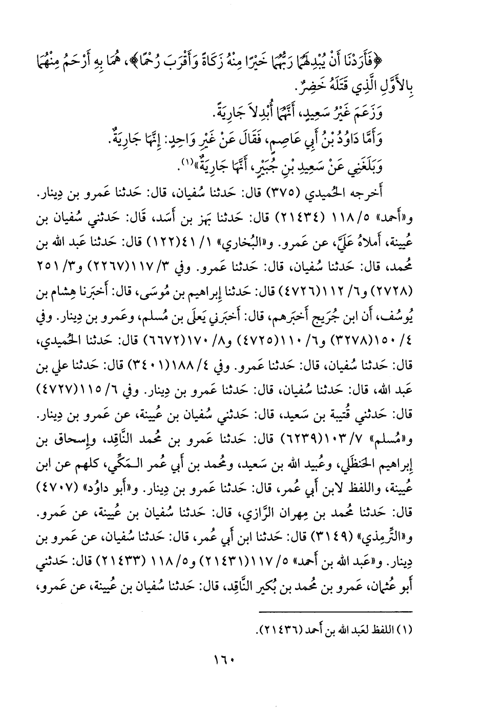 وفي ٣/ ٨٩ (٢٢٦٧) و ٣/ ١٩٢ (٢٧٢٨) و ٦/ ٨٩ (٤٧٢٦) قال: حدثنا إبراهيم بن موسى، قال: أخبرنا هشام بن يوسف، أن ابن جُريج أخبرهم، قال: أخبرني يَعلى بن مسلم، وعَمرو بن دينار. وفي ٤/ ١٢٣ (٣٢٧٨) و ٦/ ٨٨ (٤٧٢٥) و ٨/ ١٣٦ (٦٦٧٢) قال: حدثنا الحميدي، قال: حدثنا سفيان، قال: حدثنا عَمرو. وفي ٤/ ١٥٤ (٣٤٠١) قال: حدثنا علي بن عبد الله، قال: حدثنا سفيان، قال: حدثنا عَمرو بن دينار. وفي ٦/ ٩١ (٤٧٢٧) قال: حدثني قتيبة بن سعيد، قال: حدثني سفيان بن عُيينة، عن عَمرو بن دينار. و «مسلم» ٧/ ١٠٣ (٦٢٣٩) قال: حدثنا عَمرو بن محمد الناقد، وإسحاق بن إبراهيم الحنظلي، وعُبيد الله بن سعيد، ومحمد بن أبي عمر المكي، كلهم عن ابن عُيينة، واللفظ لابن أبي عمر، قال: حدثنا عَمرو بن دينار. و «أَبو داود» (٤٧٠٧) قال: حدثنا محمد بن مِهران الرازي، قال: حدثنا سفيان بن عُيينة، عن عَمرو. و «التِّرمِذي» (٣١٤٩) قال: حدثنا ابن أبي عمر، قال: حدثنا سفيان، عن عَمرو بن دينار. و «عبد الله بن أحمد» ٥/ ١١٧ (٢١٤٣١) و ٥/ ١١٨ (٢١٤٣٣) قال: حدثني أَبو عثمان، عَمرو بن محمد بن بكير الناقد، قال: حدثنا سفيان بن عُيينة، عن عَمرو،