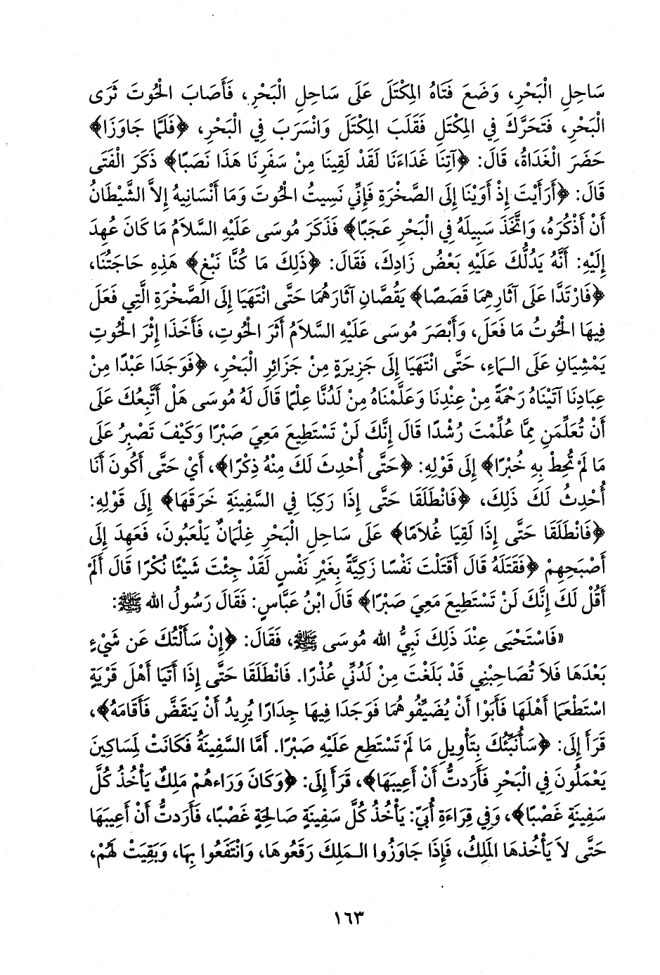 «فاستحيى عند ذلك نبي الله موسى صَلى الله عَليه وسَلم فقال: {إن سألتك عن شيء بعدها فلا تصاحبني قد بلغت من لدني عذرا. فانطلقا حتى إذا أتيا أهل قرية استطعما أهلها فأَبوا أن يضيفوهما فوجدا فيها جدارا يريد أن ينقض فأقامه}، قرأ إلى: {سأنبئك بتأويل ما لم تستطع عليه صبرا. أما السفينة فكانت لمساكين يعملون في البحر فأردت أن أعيبها}، قرأ إلى: {وكان وراءهم ملك يأخذ كل سفينة غصبا}، وفي قراءة أبي: (يأخذ كل سفينة صالحة غصبا)، فأردت أن أعيبها حتى لا يأخذها الملك، فإذا جاوزوا الملك رقعوها، وانتفعوا بها، وبقيت لهم،
