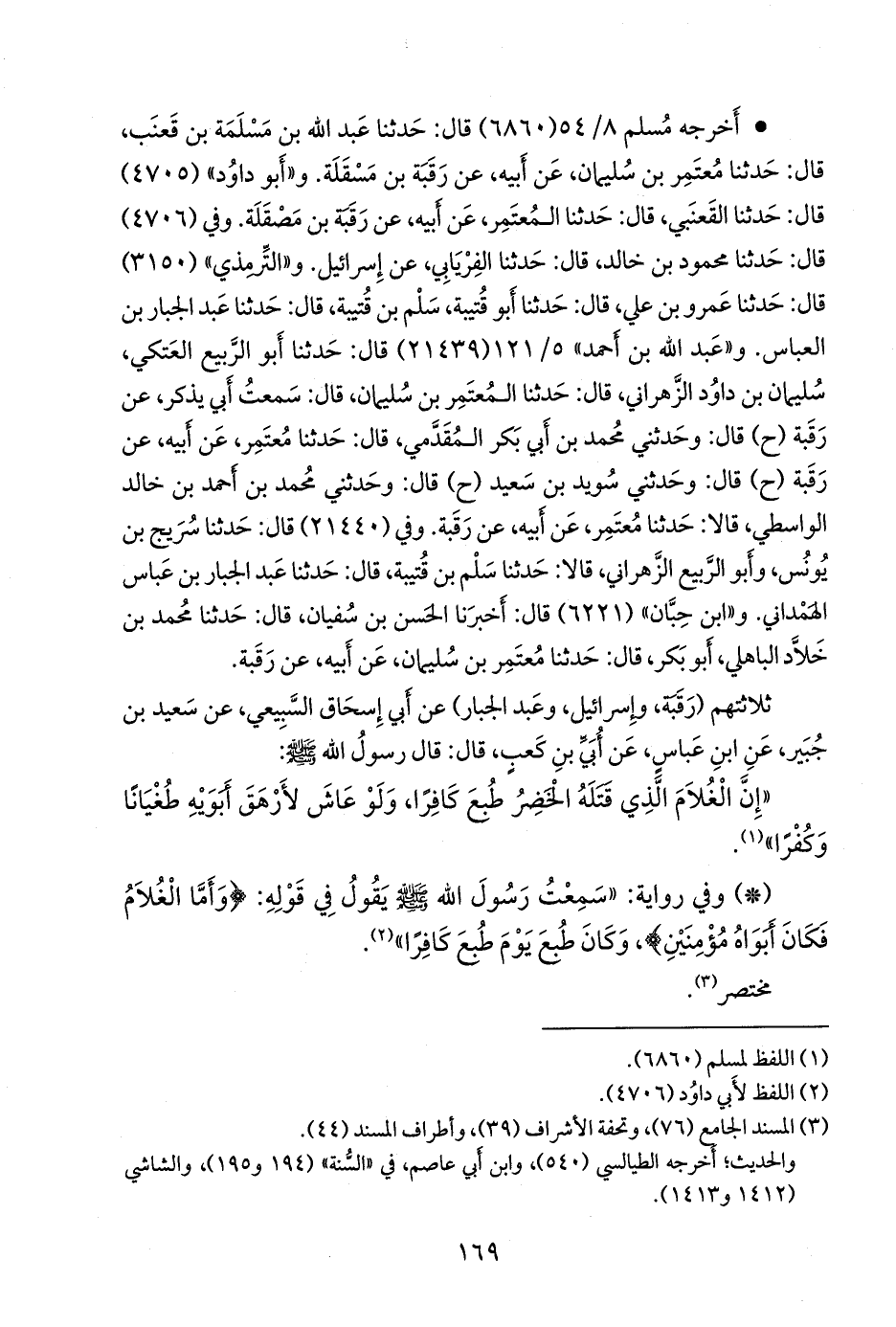 - وفي رواية: «سمعت رسول الله صَلى الله عَليه وسَلم يقول في قوله: {وأما الغلام فكان أَبواه مؤمنين}، وكان طبع يوم طبع كافرا» (¬٢).