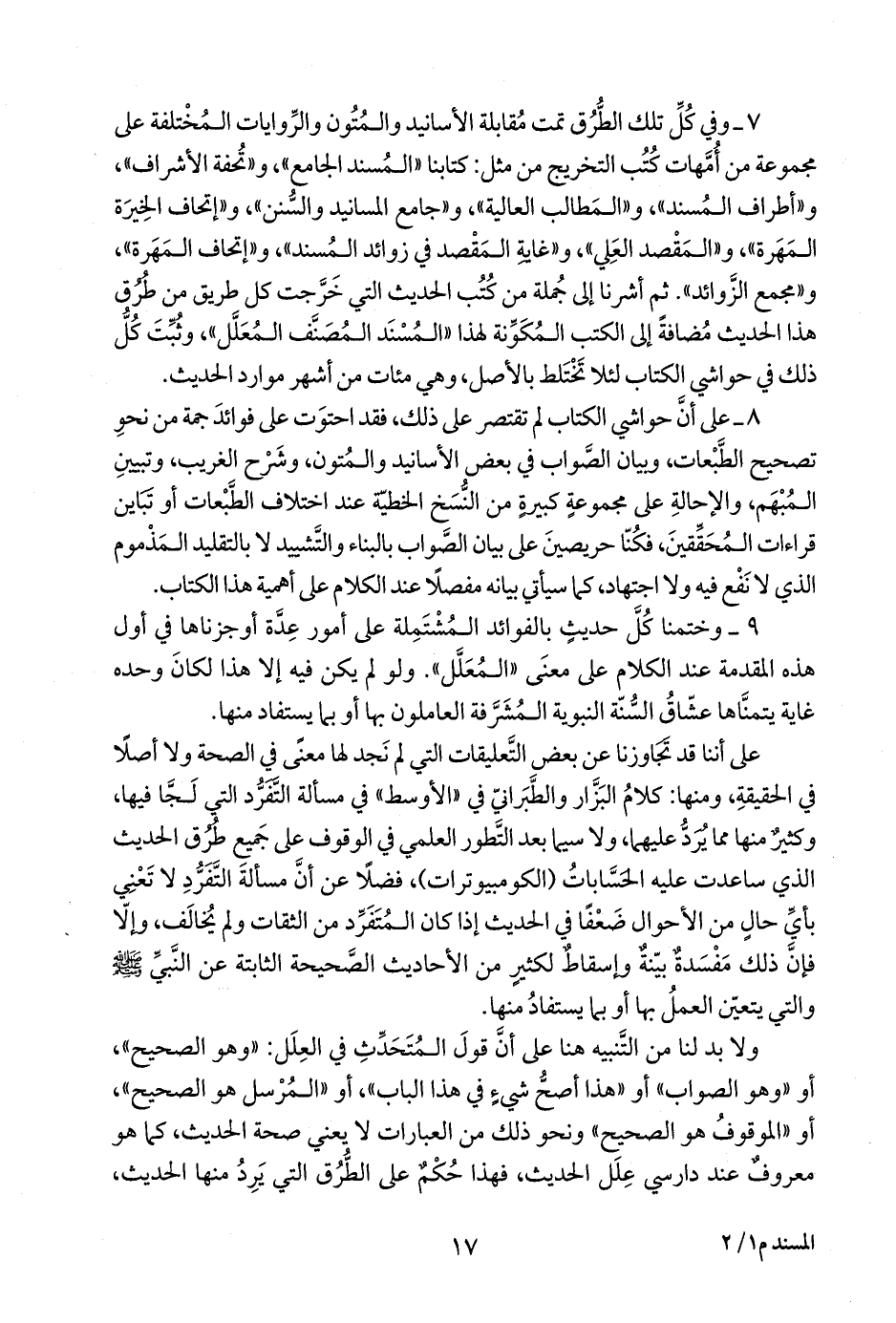 ٧ - وفي كُلِّ تلك الطُّرُق تمت مُقابلة الأسانيد والمُتُون والرِّوايات المُخْتلفة على مجموعة من أُمَّهات كُتُب التخريج من مثل: كتابنا "المُسند الجامع"، و"تُحفة الأشراف"، و"أطراف المُسند"، و"المَطالب العالية"، و"جامع المسانيد والسُّنن"، و"إتحاف الخِيرَة المَهَرة"، و"المَقْصد العَلي"، و"غايةِ المَقْصد في زوائد المُسند"، و"إتحاف المَهَرة"، و"مجمع الزَّوائد". ثم أشرنا إلى جُملة من كُتُب الحديث التي خَرَّجت كل طريق من طُرُق هذا الحديث مُضافةً إلى الكتب المُكَوِّنة لهذا "المُسْنَد المُصنَّف المُعَلَّل"، وثُبِّتَ كُلُّ ذلك في حواشي الكتاب لئلا تَخْتَلط بالأصل، وهي مئات من أشهر موارد الحديث.