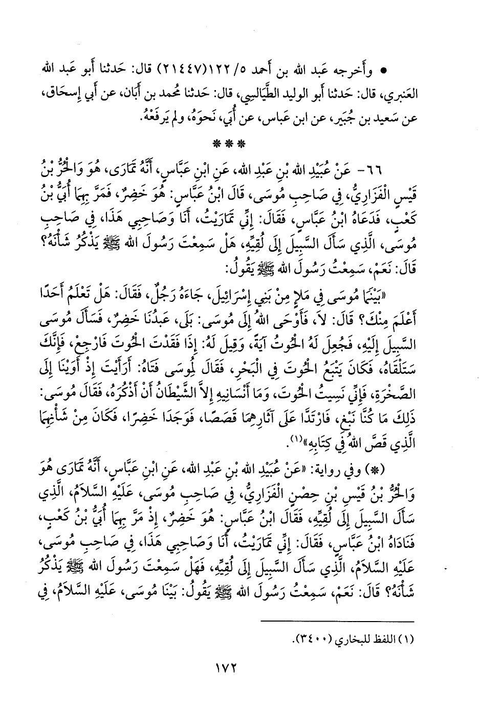 - وفي رواية: «عن عُبيد الله بن عبد الله، عن ابن عباس، أنه تمارى هو والحر بن قيس بن حصن الفزاري، في صاحب موسى، عليه السلام، الذي سأل السبيل إلى لقيه، فقال ابن عباس: هو خضر، إذ مر بهما أُبي بن كعب، فناداه ابن عباس، فقال: إني تماريت، أنا وصاحبي هذا، في صاحب موسى، عليه السلام، الذي سأل السبيل إلى لقيه، فهل سمعتَ رسول الله صَلى الله عَليه وسَلم يذكر شأنه؟ قال: نعم، سمعت رسول الله صَلى الله عَليه وسَلم يقول: بينا موسى، عليه السلام، في