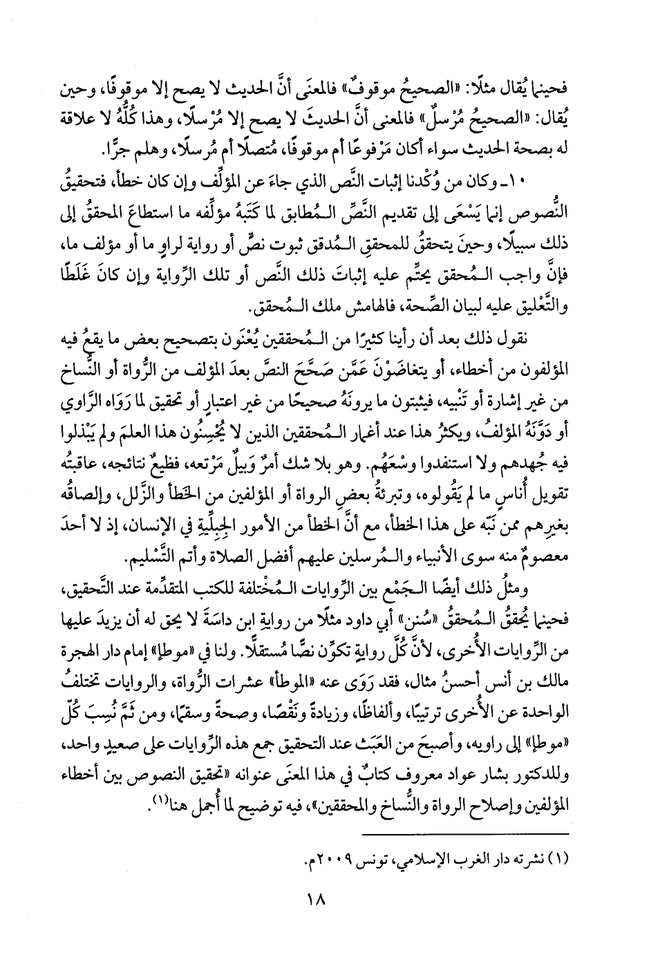 ١٠ - وكان من وُكْدنا إثبات النَّص الذي جاءَ عن المؤلِّف وإن كان خطأ، فتحقيقُ النُّصوص إنما يَسْعَى إلى تقديم النَّصِّ المُطابق لما كَتَبهُ مؤلِّفه ما استطاعَ المحققُ إلى ذلك سبيلًا، وحينَ يتحققُ للمحققِ المُدقق ثبوت نصٍّ أو رواية لراوٍ ما أو مؤلف ما، فإنَّ واجب المُحقق يحتِّم عليه إثباتَ ذلك النَّص أو تلك الرِّواية وإن كانَ غَلَطًا والتَّعْليق عليه لبيان الصِّحة، فالهامش ملك المُحقق.