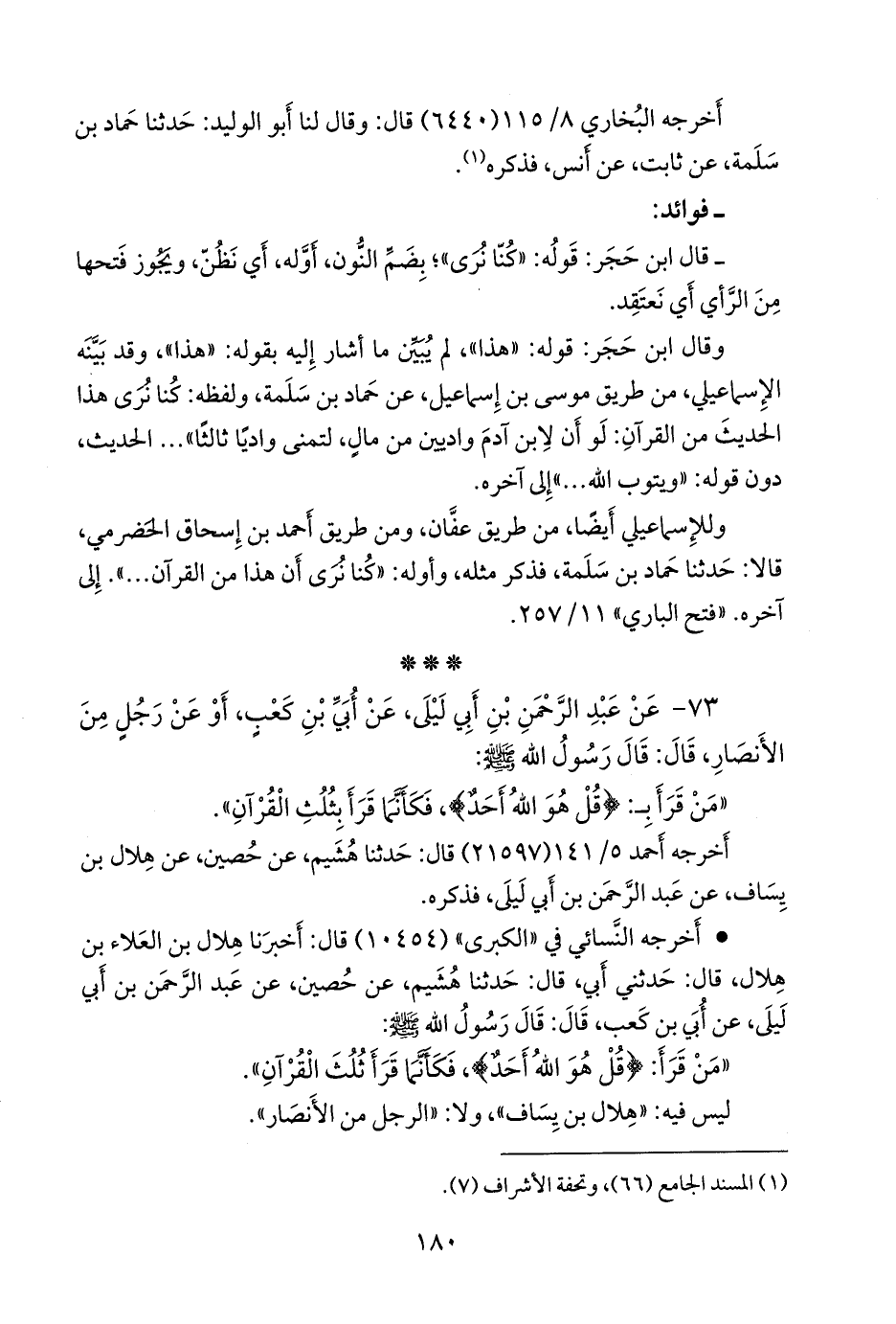 ٧٣ - عن عبد الرَّحمَن بن أبي ليلى، عن أُبي بن كعب، أو عن رجل من الأنصار، قال: قال رسول الله صَلى الله عَليه وسَلم: