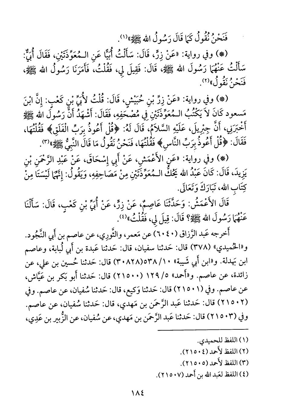 - وفي رواية: «عن الأعمش، عن أبي إسحاق، عن عبد الرَّحمَن بن يزيد، قال: كان عبد الله يحك المعوذتين من مصاحفه، ويقول: إنهما ليستا من كتاب الله، تبارك وتعالى.