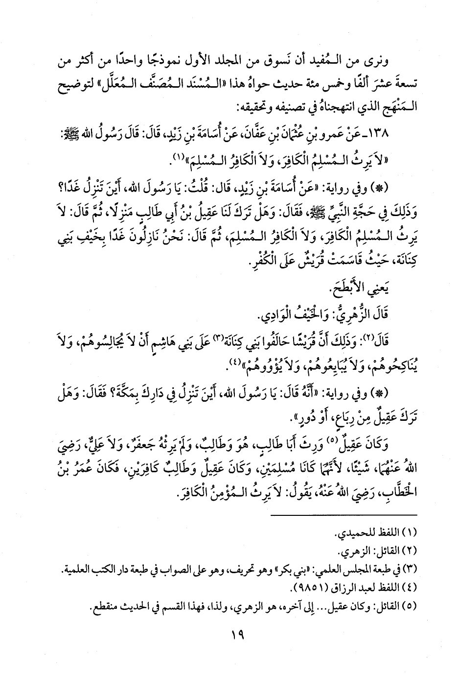 ١٣٨ - عَنْ عَمرو بْنِ عُثْمَانَ بْنِ عَفَّانَ، عَنْ أُسَامَةَ بْنِ زيدٍ، قَالَ: قَالَ رَسُولُ الله - صلى الله عليه وسلم -: "لا يَرِثُ المُسْلِمُ الْكَافِرَ، وَلا الْكَافِرُ المُسْلِمَ" (١).