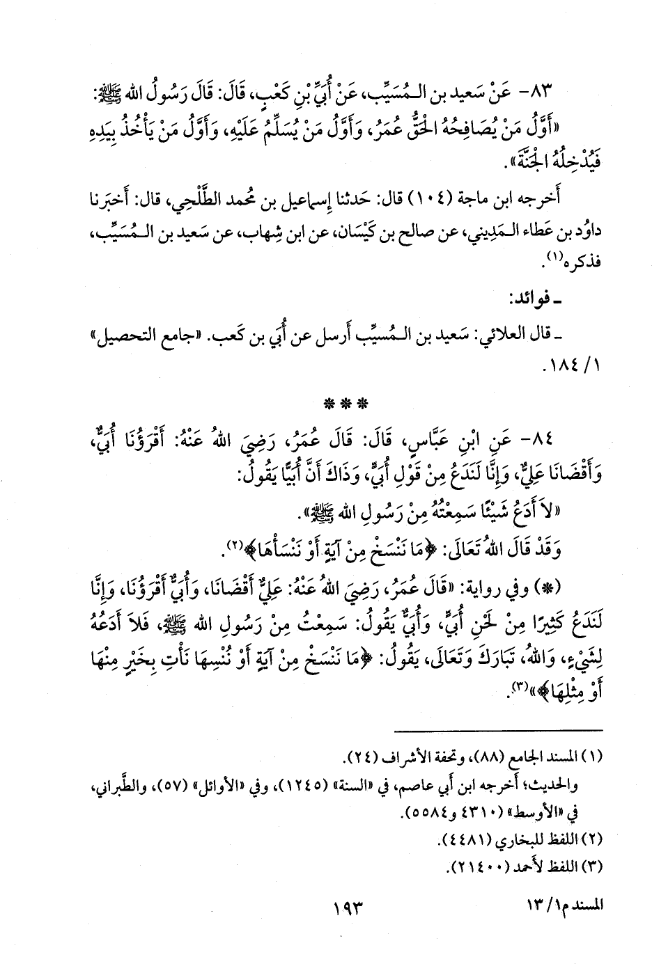 ٨٤ - عن عبد الله بن عباس، قال: قال عمر، رضي الله عنه: أقرؤنا أبي، وأقضانا علي، وإنا لندع من قول أبي، وذاك أن أُبَيًّا يقول: