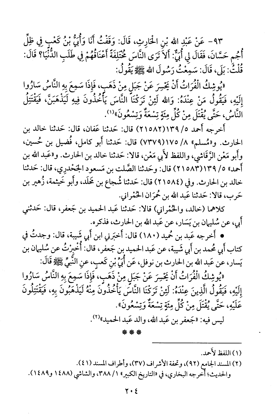 «يوشك الفرات أن يحسر عن جبل من ذهب، فإذا سمع به الناس ساروا إليه، فيقول الذين عنده: لئن تركنا الناس يأخذون منه ليذهبون به، فيقتتلون عليه، حتى يقتل من كل مئة تسعة وتسعون».