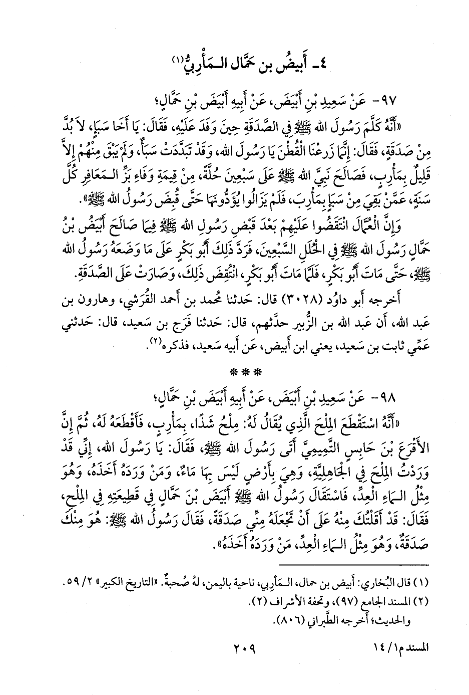 كلاهما (الحميدي، والعدني) عن فرج بن سعيد بن علقمة بن سعيد بن أبيض بن حمال، قال: حدثني عمي ثابت بن سعيد بن أبيض بن حمال، عن أبيه سعيد، فذكره (¬٢).