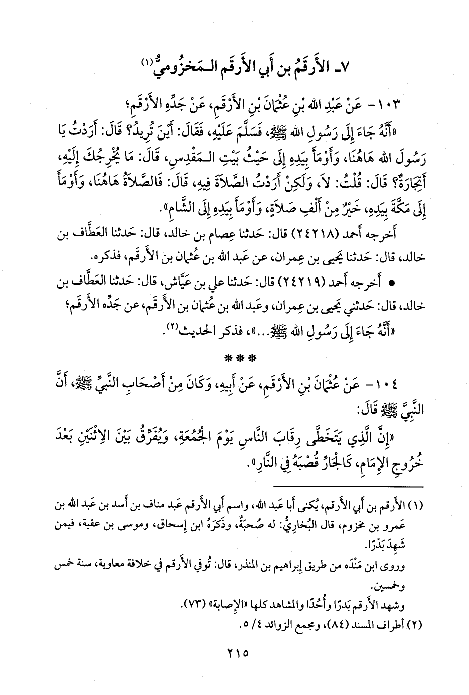 ١٠٤ - عن عثمان بن الأرقم، عن أبيه، وكان من أصحاب النبي صَلى الله عَليه وسَلم أن النبي صَلى الله عَليه وسَلم قال: