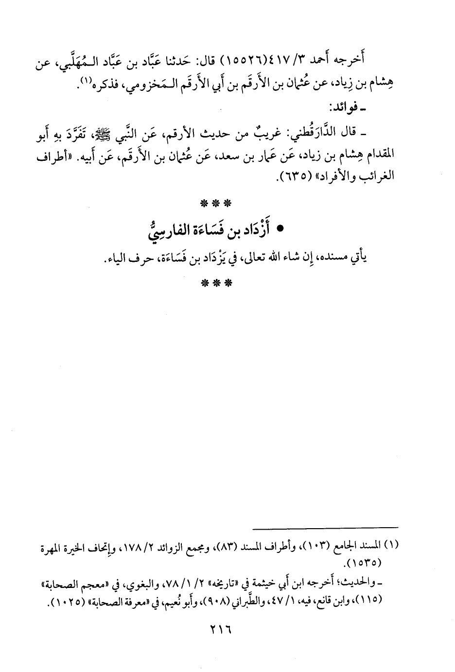 (¬١) قال العلائي: أزداد بن فَسَاءة، ويُقال: يزداد، الفارسي، مولى بَحِير بن رَيْسان اليماني، له في «مسند أحمد»، و «سنن أبي داود»، و «ابن ماجة»، عن النبي صَلى الله عَليه وسَلم حديث: «إذا بال أحدكم فلينثر ذكره ثلاثًا» قال ابن أَبي حاتم عن أبيه: هو مُرسَل، أي أنه تابعي، وقال ابن عبد البَر: يُقال له: صُحبةٌ، وأكثرُهم لا يَعرفونه وقد قيل حديثه مُرسَل. «جامع التحصيل» ١/ ١٤٣.