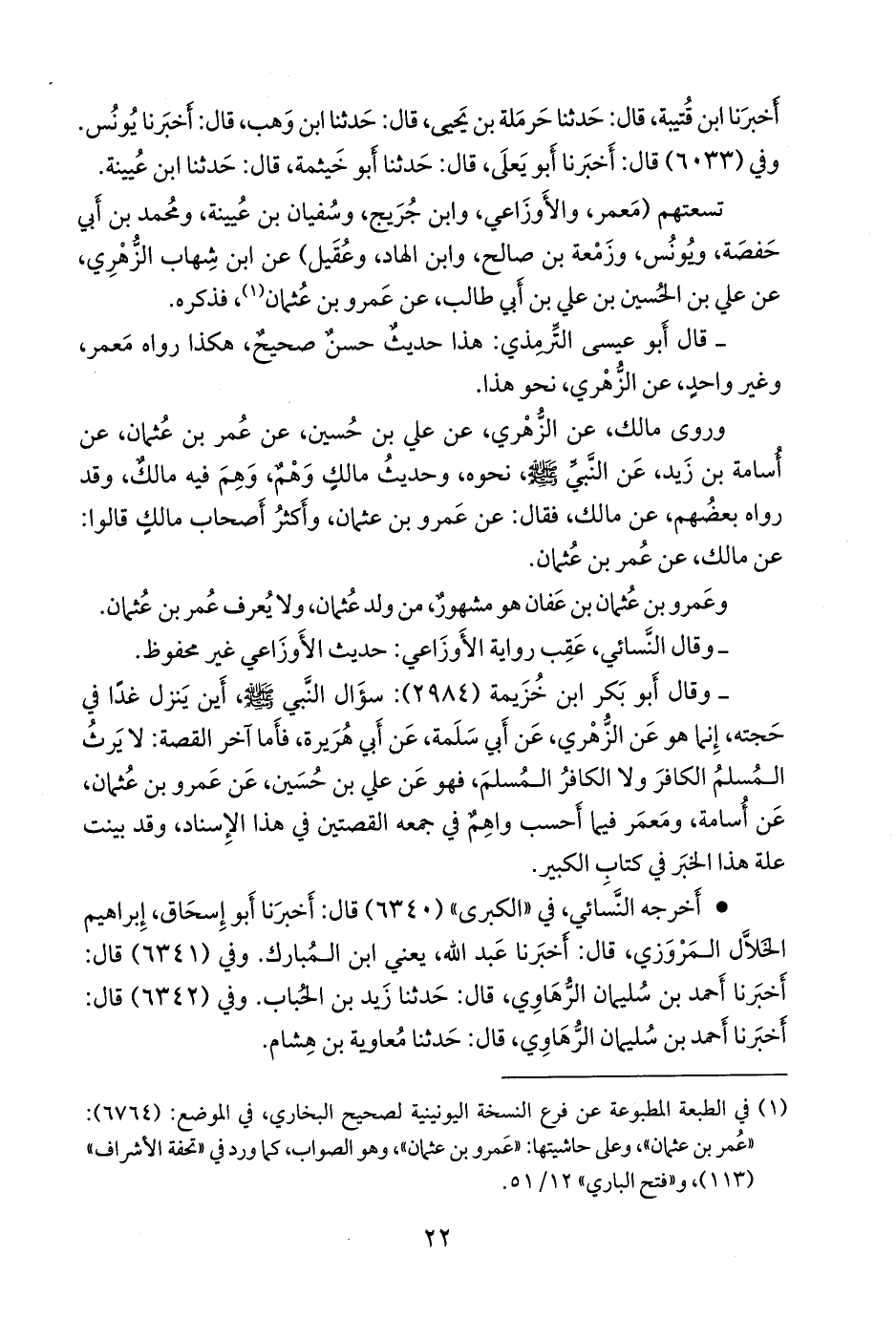 تسعتهم (مَعمر، والأَوزَاعي، وابن جُرَيج، وسُفيان بن عُيينة، ومُحمد بن أَبي حَفصَة، ويُونُس، وزَمْعة بن صالح، وابن الهاد، وعُقَيل) عن ابن شِهاب الزُّهْرِي، عن علي بن الحُسين بن علي بن أَبي طالب، عن عَمرو بن عُثمان (١)، فذكره.