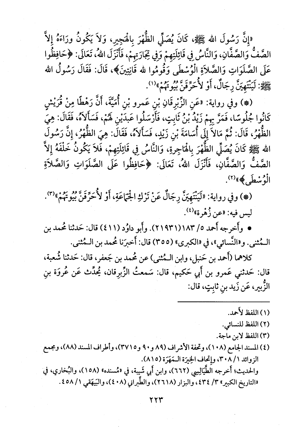 - وفي رواية: «عن الزبرقان بن عَمرو بن أُمية، أن رهطا من قريش كانوا جلوسا، فمر بهم زيد بن ثابت، فأرسلوا عبدين لهم، فسألاه، فقال: هي الظهر، قال: ثم مالا إلى أُسامة بن زيد، فسألاه، فقال: هي الظهر، إن رسول الله صَلى الله عَليه وسَلم كان يصلي الظهر بالهاجرة، والناس في قائلتهم، فلا يكون خلفه إلا الصف والصفان، فأنزل الله، تعالى: {حافظوا على الصلوات والصلاة الوسطى}» (¬١).