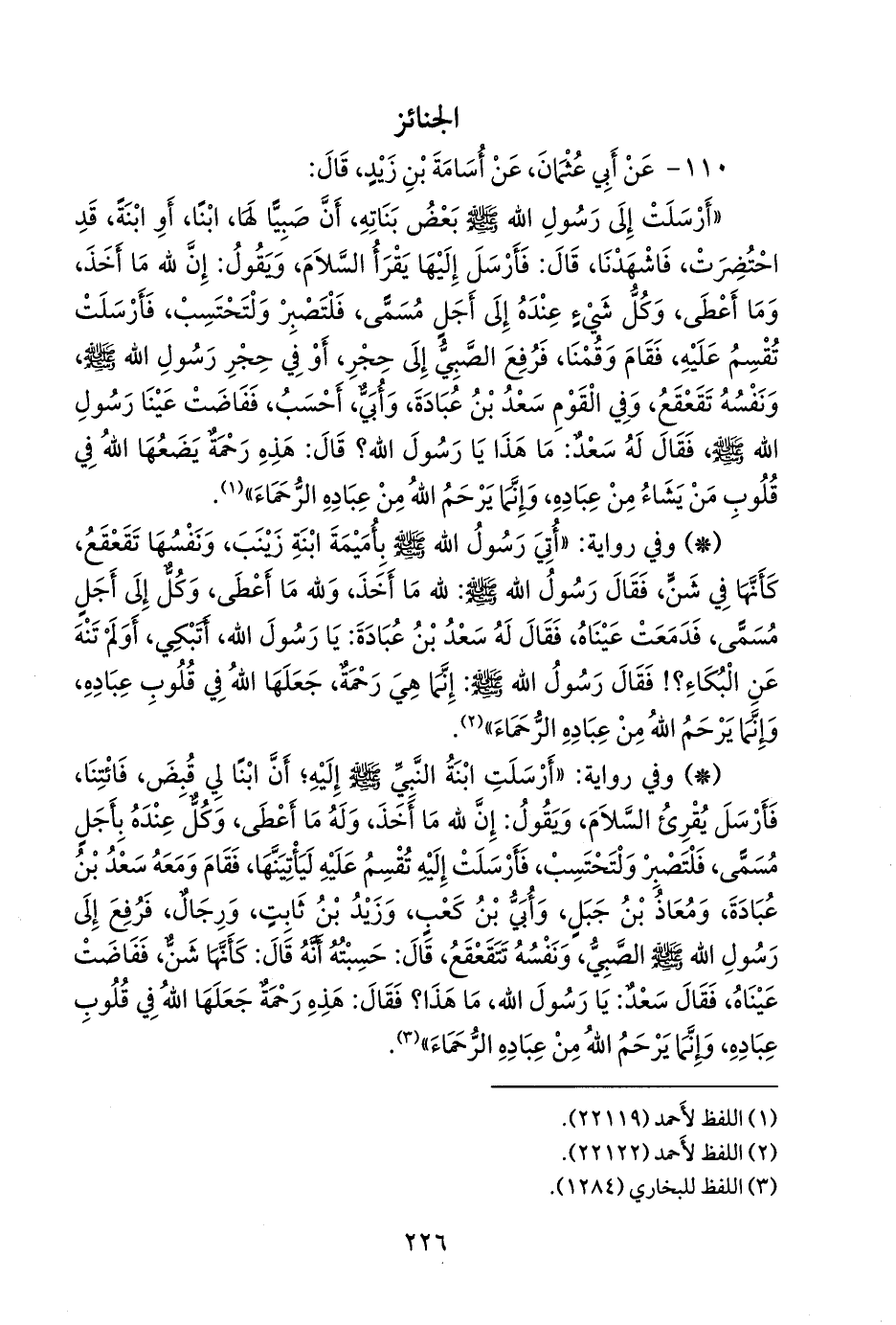 «أرسلت إلى رسول الله صَلى الله عَليه وسَلم بعض بناته، أن صبيا لها، ابنا، أو ابنة، قد احتضرت، فاشهدنا، قال: فأرسل إليها يقرأ السلام، ويقول: إن لله ما أخذ، وما أعطى، وكل شيء عنده إلى أجل مسمى، فلتصبر ولتحتسب، فأرسلت تقسم عليه، فقام وقمنا، فرفع الصبي إلى حجر، أو في حجر رسول الله صَلى الله عَليه وسَلم ونفسه تقعقع، وفي القوم سعد بن عبادة، وأبي، أحسب، ففاضت عينا رسول الله صَلى الله عَليه وسَلم فقال له سعد: ما هذا يا رسول الله؟ قال: هذه رحمة يضعها الله في قلوب من شاء من عباده، وإنما يرحم الله من عباده الرحماء» (¬١).