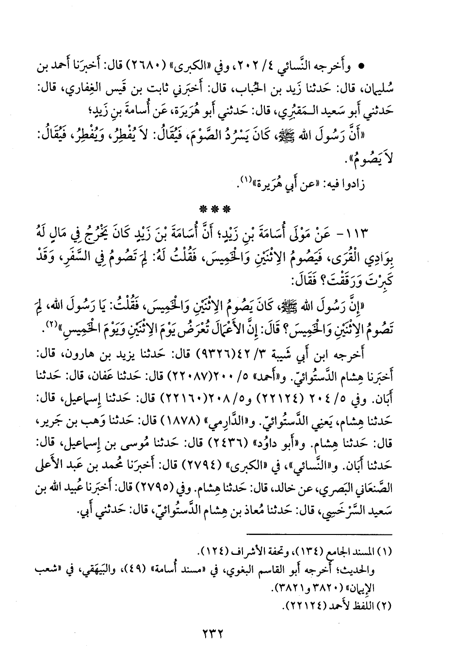 ١١٣ - عن مولى أُسامة بن زيد؛ أن أُسامة بن زيد كان يخرج في مال له بوادي القرى، فيصوم الاثنين والخميس، فقلت له: لم تصوم في السفر، وقد كبرت ورققت؟ فقال: