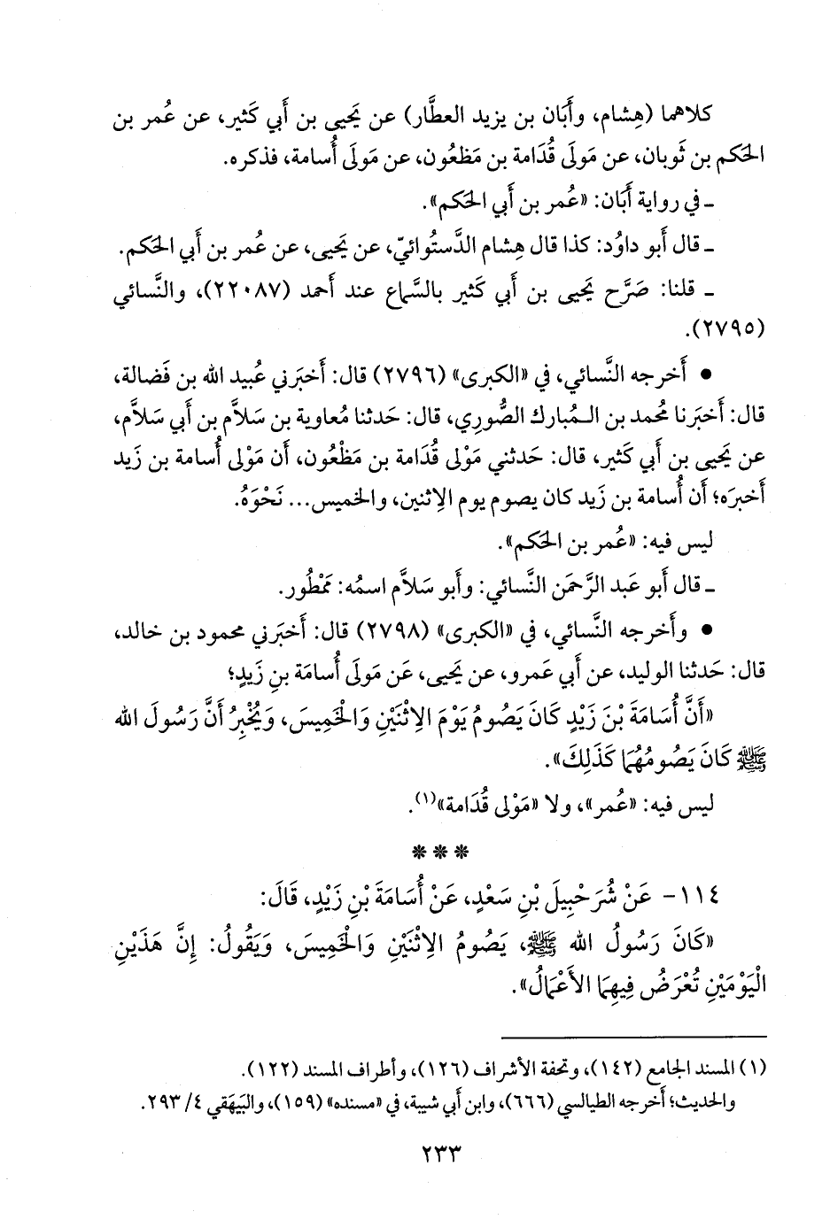 - أخرجه النَّسَائي في «الكبرى» (٢٧٩٦) قال: أخبرني عُبيد الله بن فضالة، قال: أخبرنا محمد بن المبارك الصوري، قال: حدثنا معاوية بن سلَّام بن أبي سلام، عن يحيى بن أبي كثير، قال: حدثني مولى قدامة بن مظعون، أن مولى أُسامة بن زيد أخبره؛ أن أُسامة بن زيد كان يصوم يوم الاثنين، والخميس، نَحوَه.