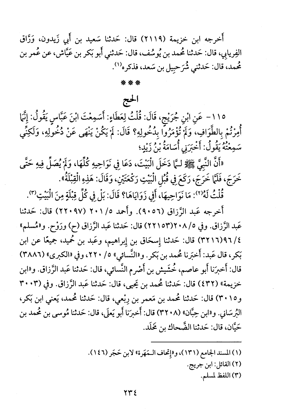 ١١٥ - عن ابن جُريج، قال: قلت لعطاء: أسمعت ابن عباس يقول: إنما أمرتم بالطواف، ولم تؤمروا بدخوله؟ قال: لم يكن ينهى عن دخوله، ولكني سمعته يقول: أخبرني أُسامة بن زيد؛